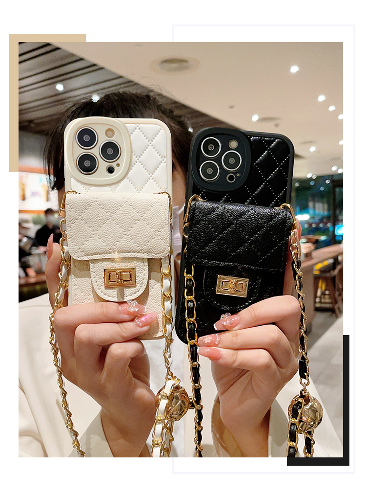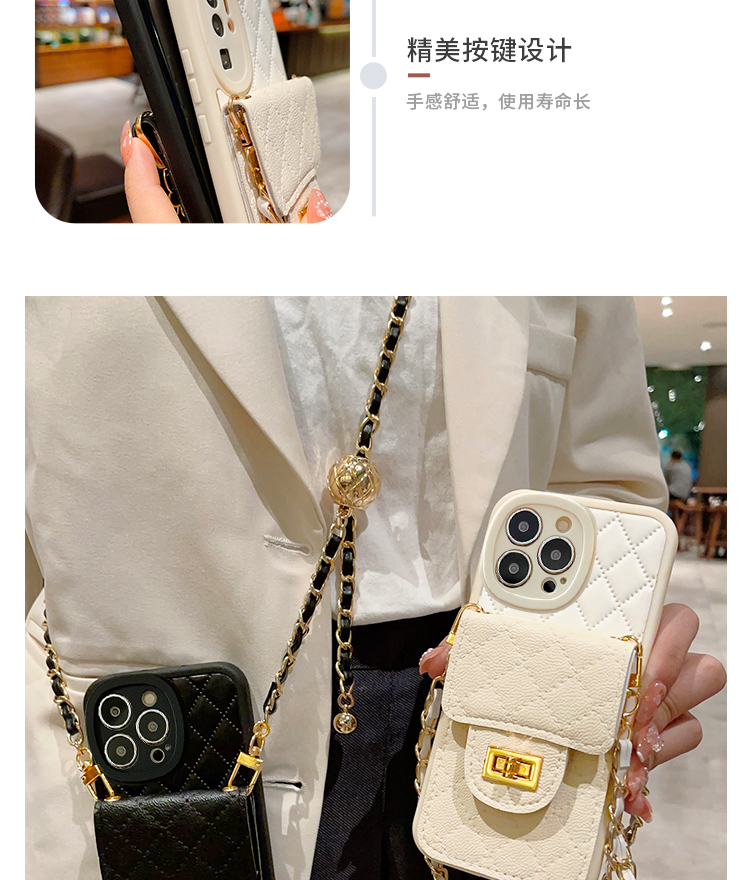 小香風潮牌適用蘋果14Promax手機殼iPhone13奢華菱格皮質12Pro紐扣卡包11可調節X/8Plus斜跨背帶7P女款防摔Xr