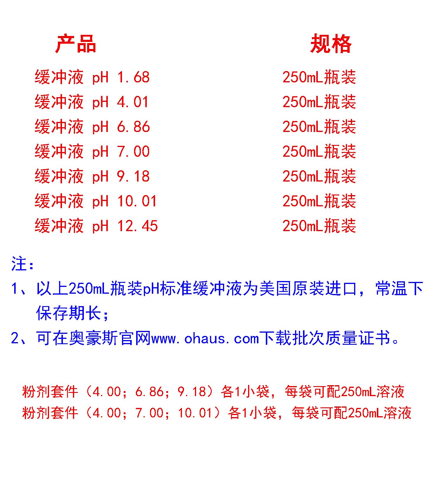 奧豪斯pH緩沖液OHAUS4.01/6.86/7.00/9.18/10.00/12.45校準液1.68