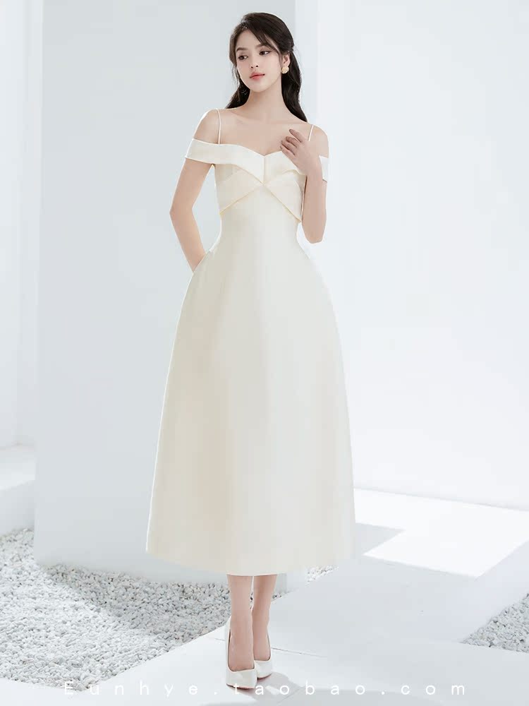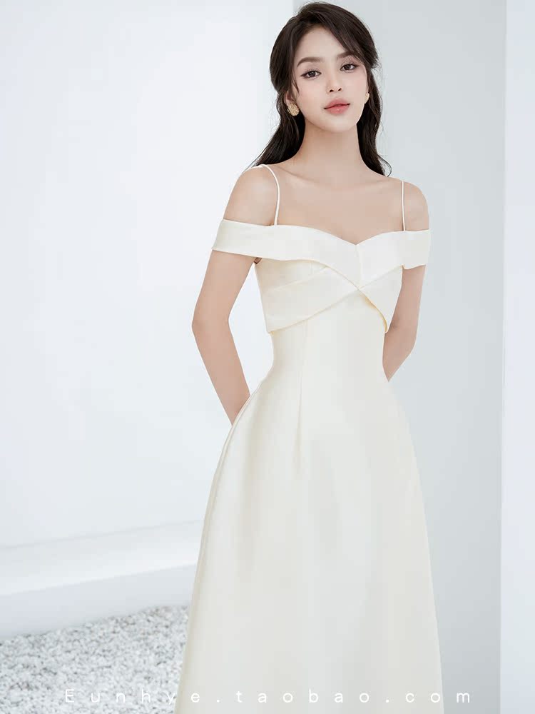 越南DE NIO設計師品牌 2022秋季新款珍珠白優雅吊袖高收腰吊帶裙