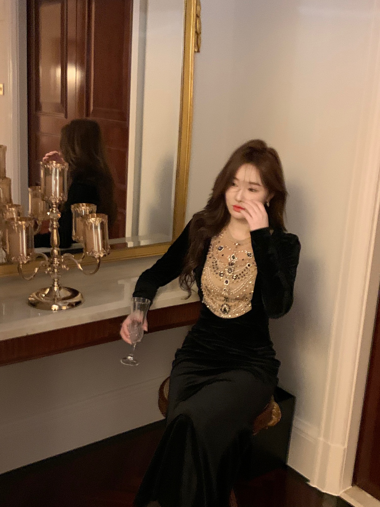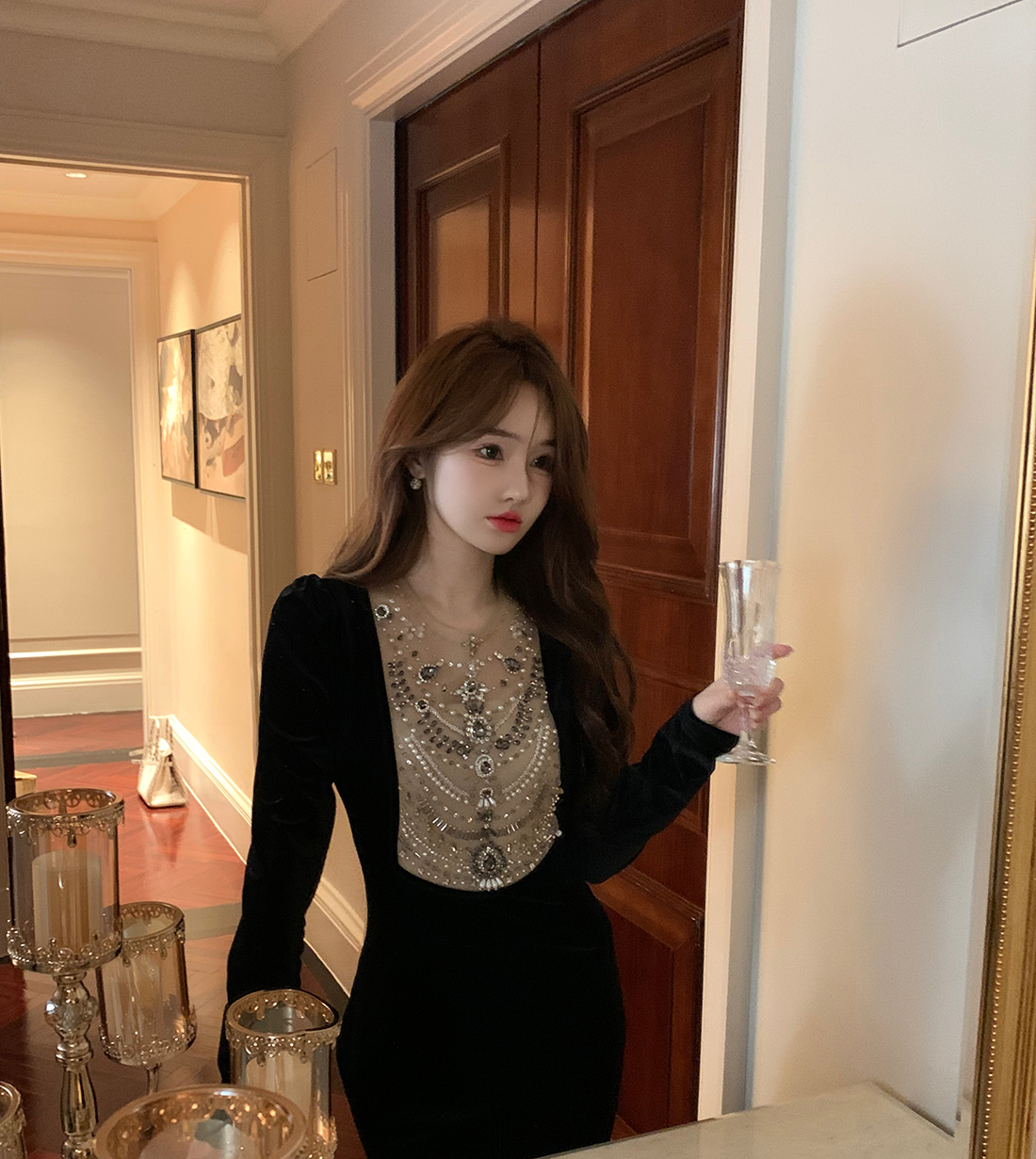 【繆斯女神】chao美 黑色絲絨年會宴會訂珠人手一件長禮服連衣裙