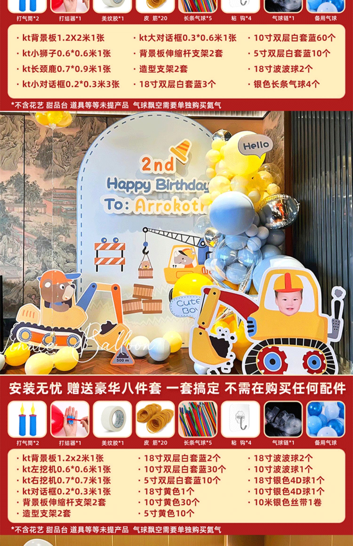 挖掘機女寶寶男一周歲生日裝飾場景布置氣球派對kt板背景墻森系