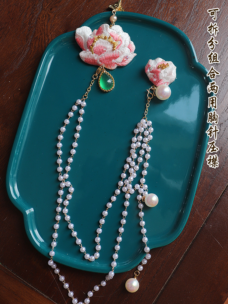 原創設計刺繡牡丹珠鏈手工胸針旗袍壓襟多用中式可拆分掛件女胸針