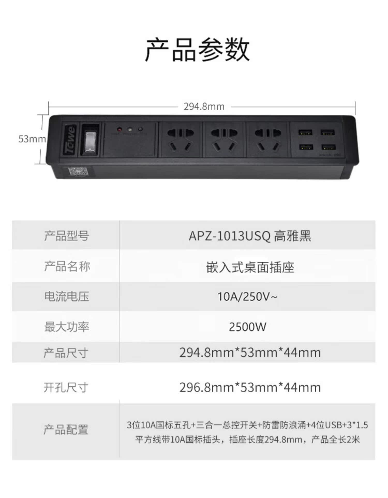 TOWE同為嵌入式插座插排多功能桌面家具書桌臥室床頭柜隱藏插板