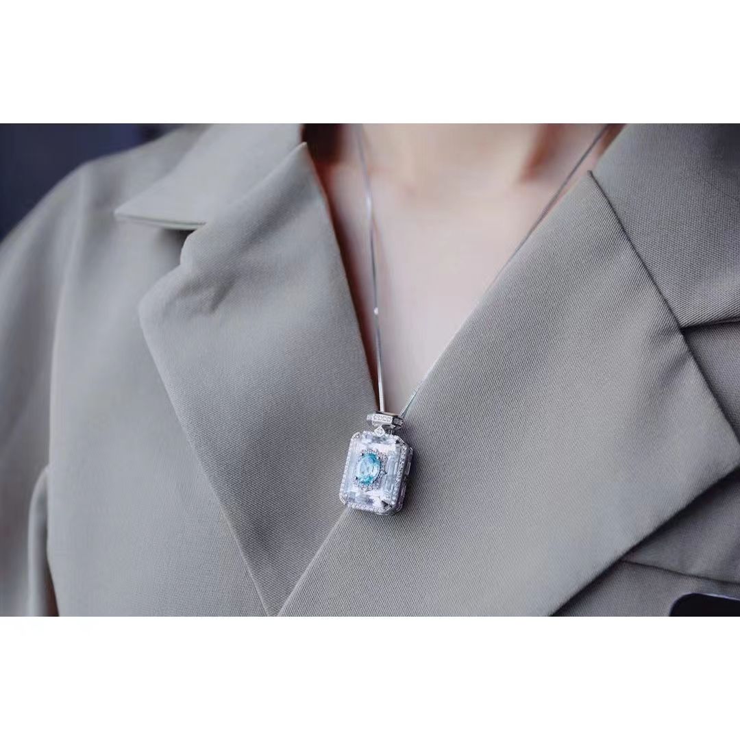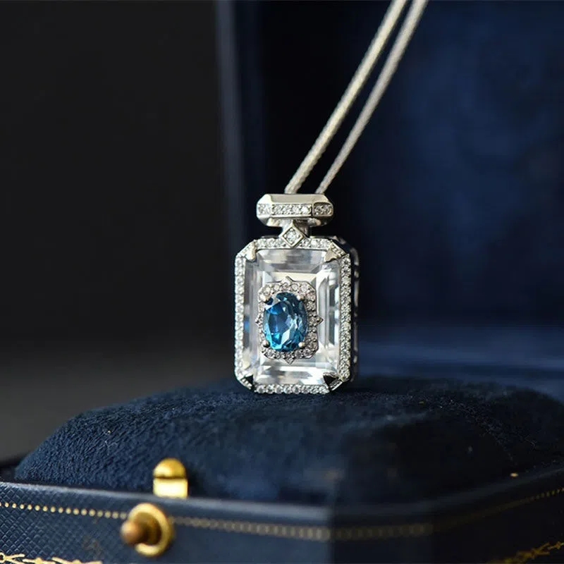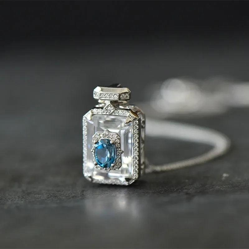 S925銀嵌托帕藍香水瓶吊墜女款精美時尚氣質白水晶鋯石復古項鏈