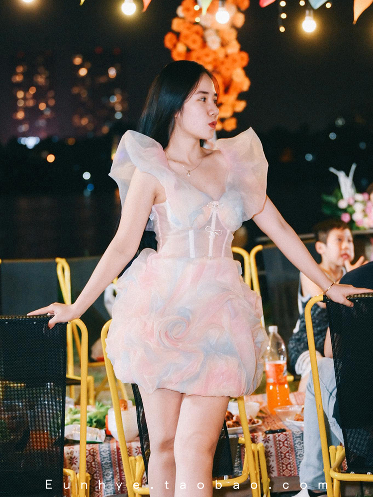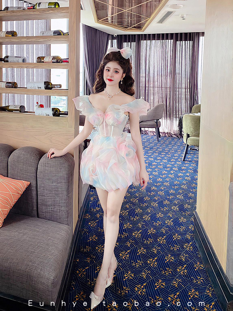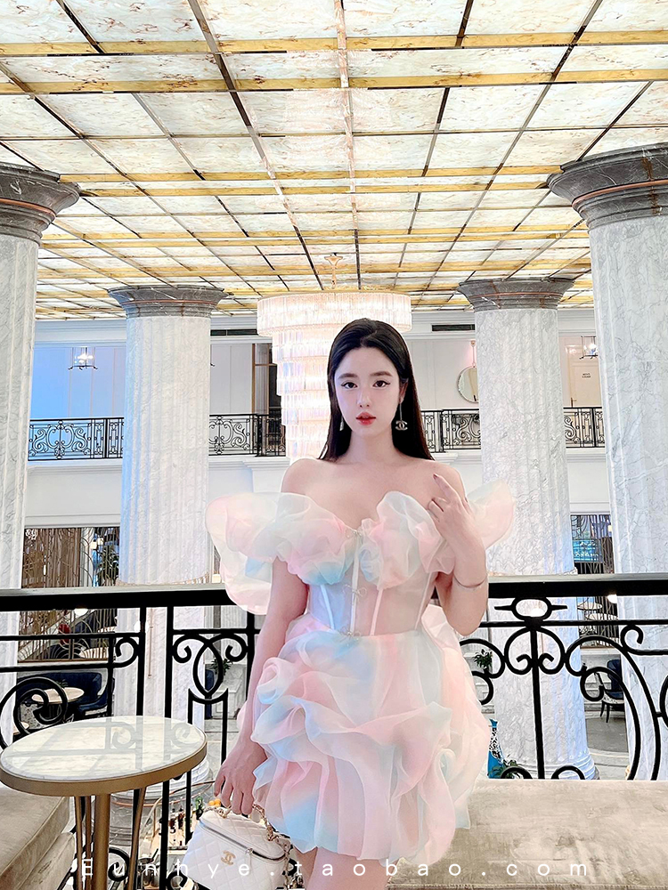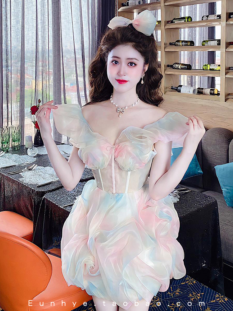 越南小眾MADDY HATES 2022冬季新款彩虹云朵泡芙暈染感高腰連衣裙