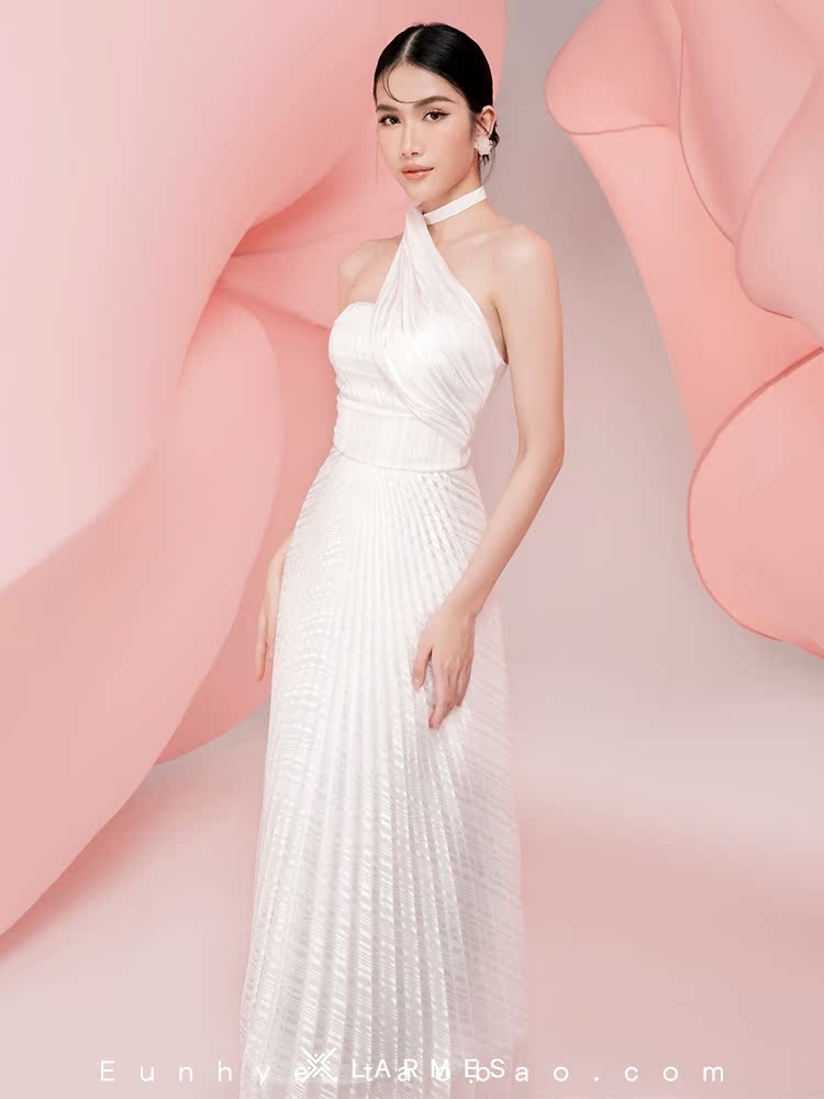 越南小眾DELICATE 2023年春季新款花朵薄紗水鉆腰帶珍珠掛脖長裙