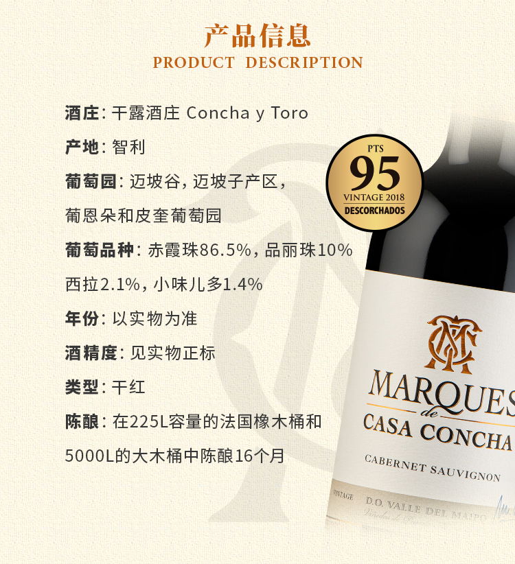 【自營】ConchaYToro智利原裝干露侯爵卡本妮蘇維翁葡萄酒750ml