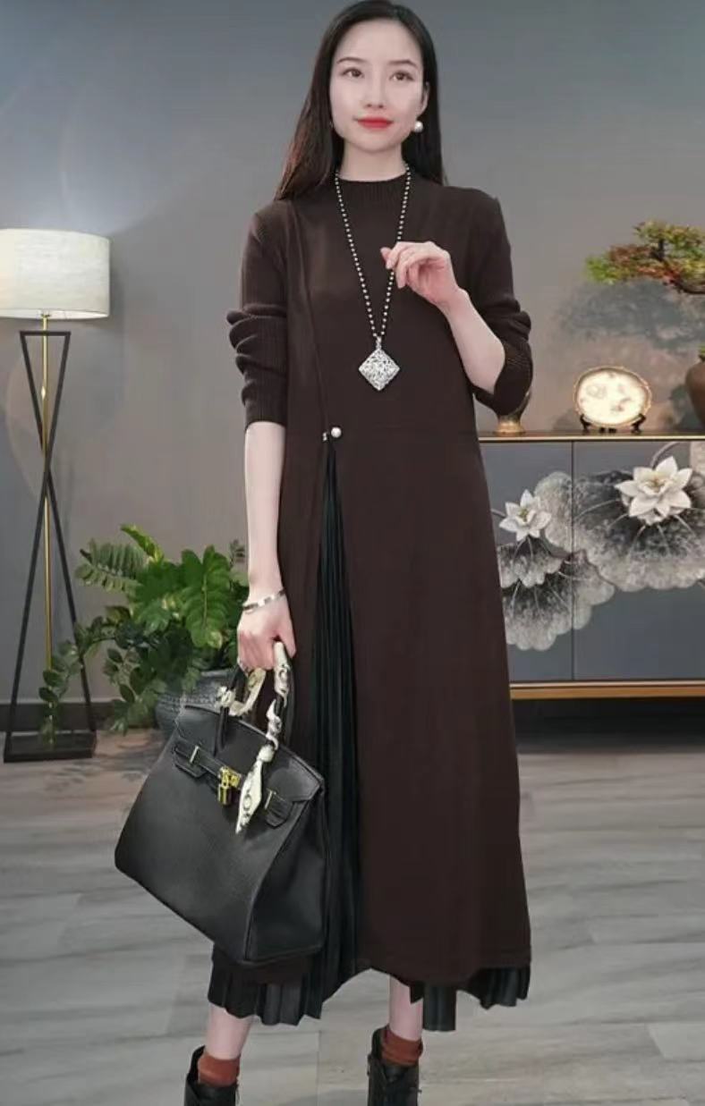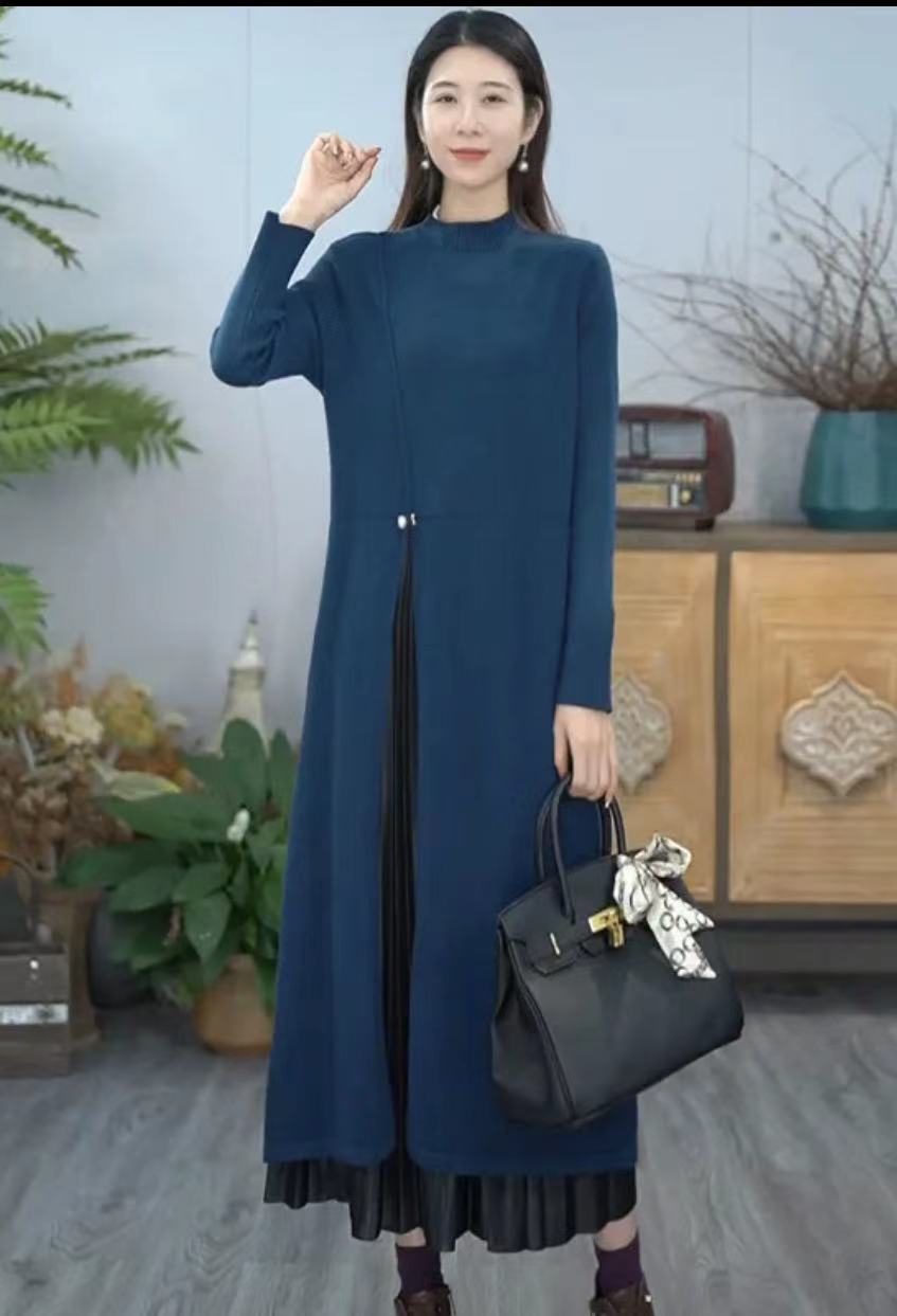 長袖羊毛針織連體裙女過膝長裙假兩件秋冬季新品洋氣保暖百搭減齡