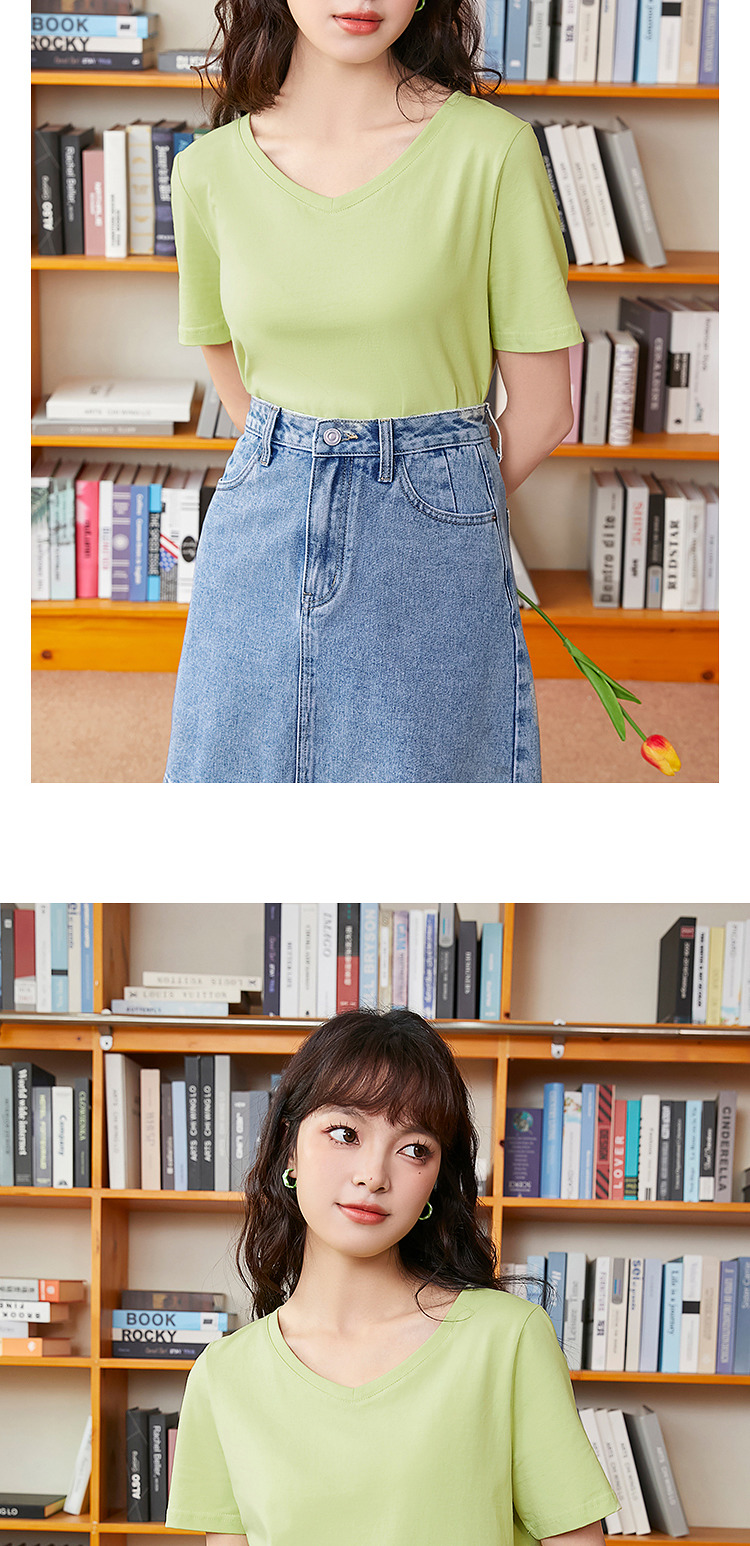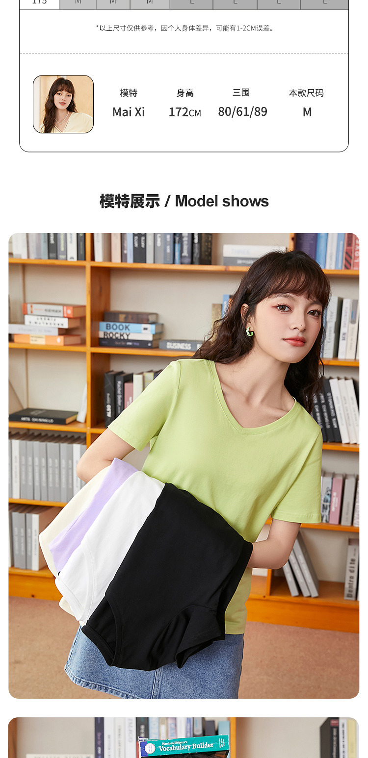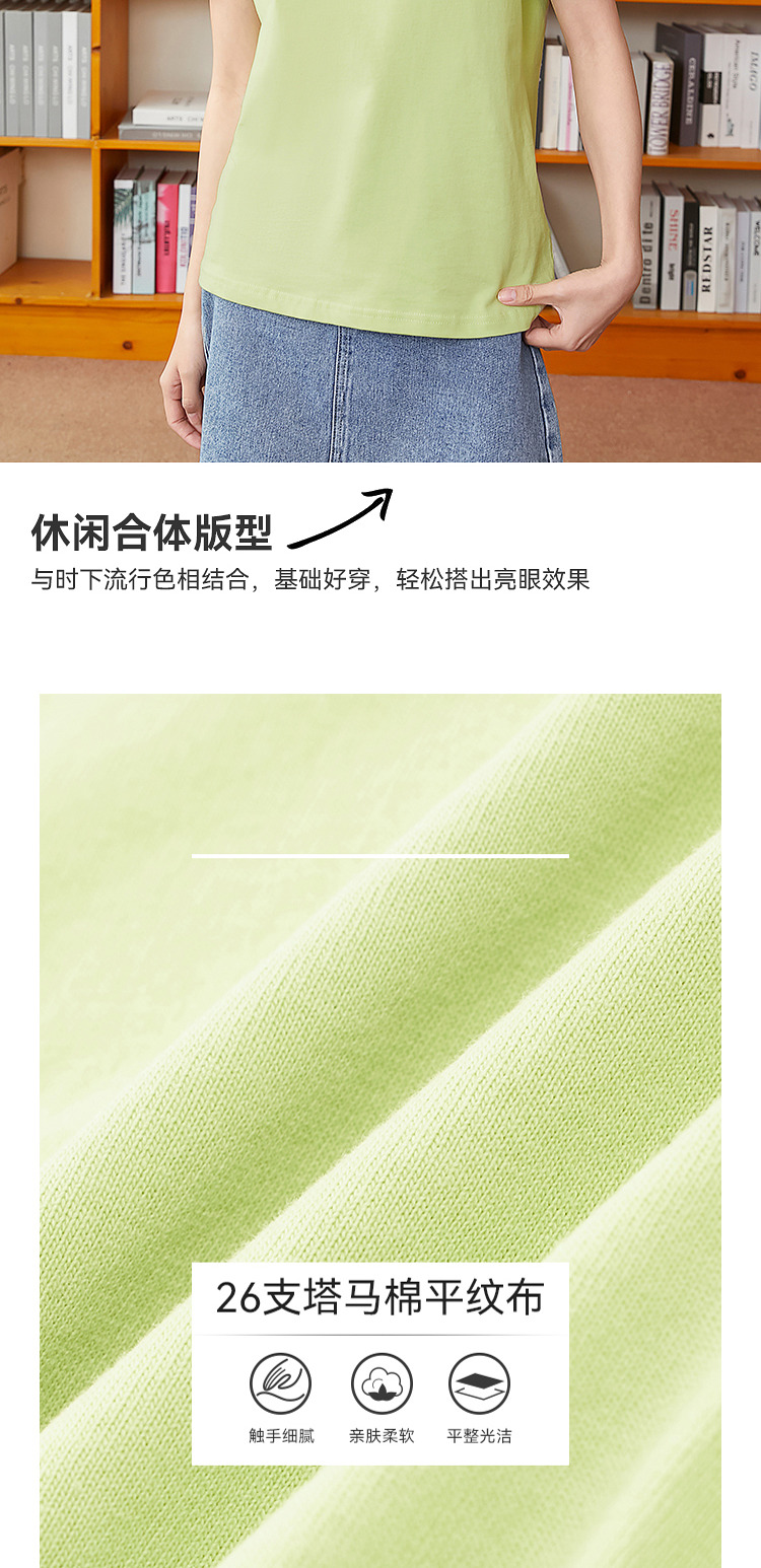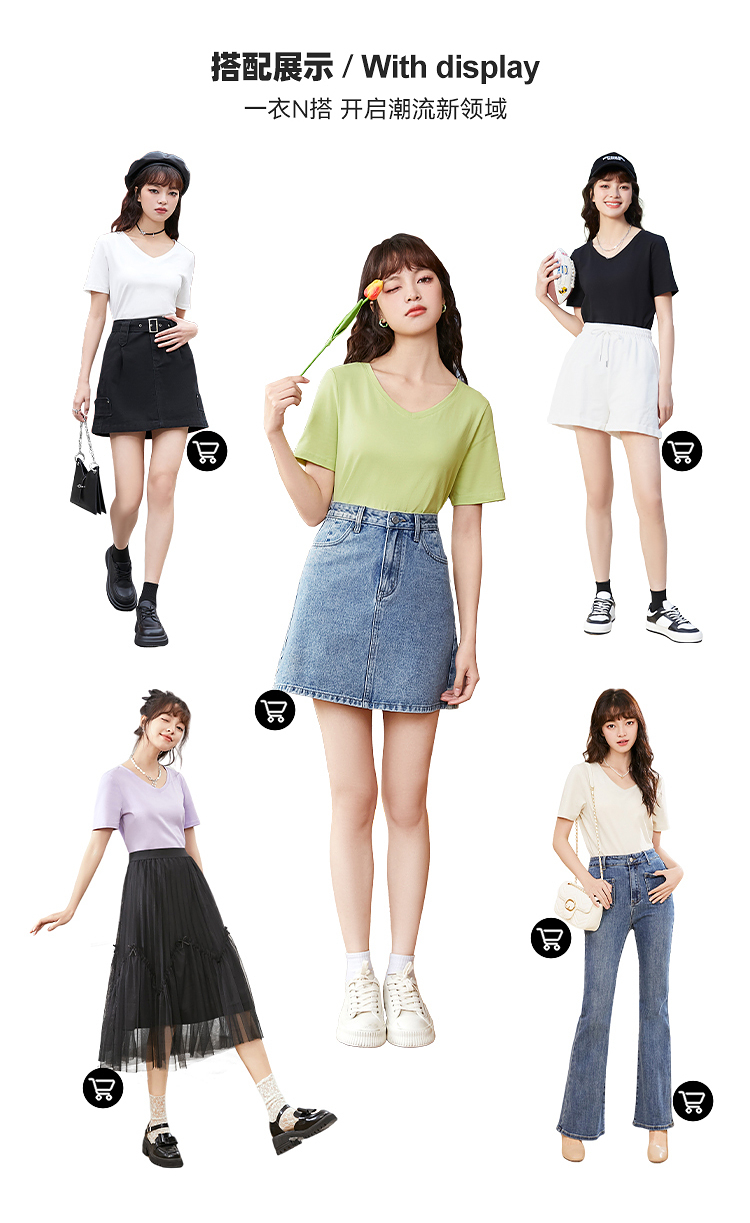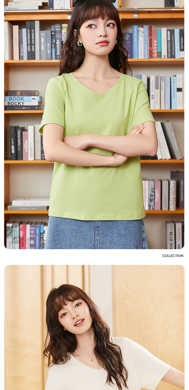三福短袖T恤女2023夏季新款寬松正肩V領體恤純色圓領純棉上衣女裝
