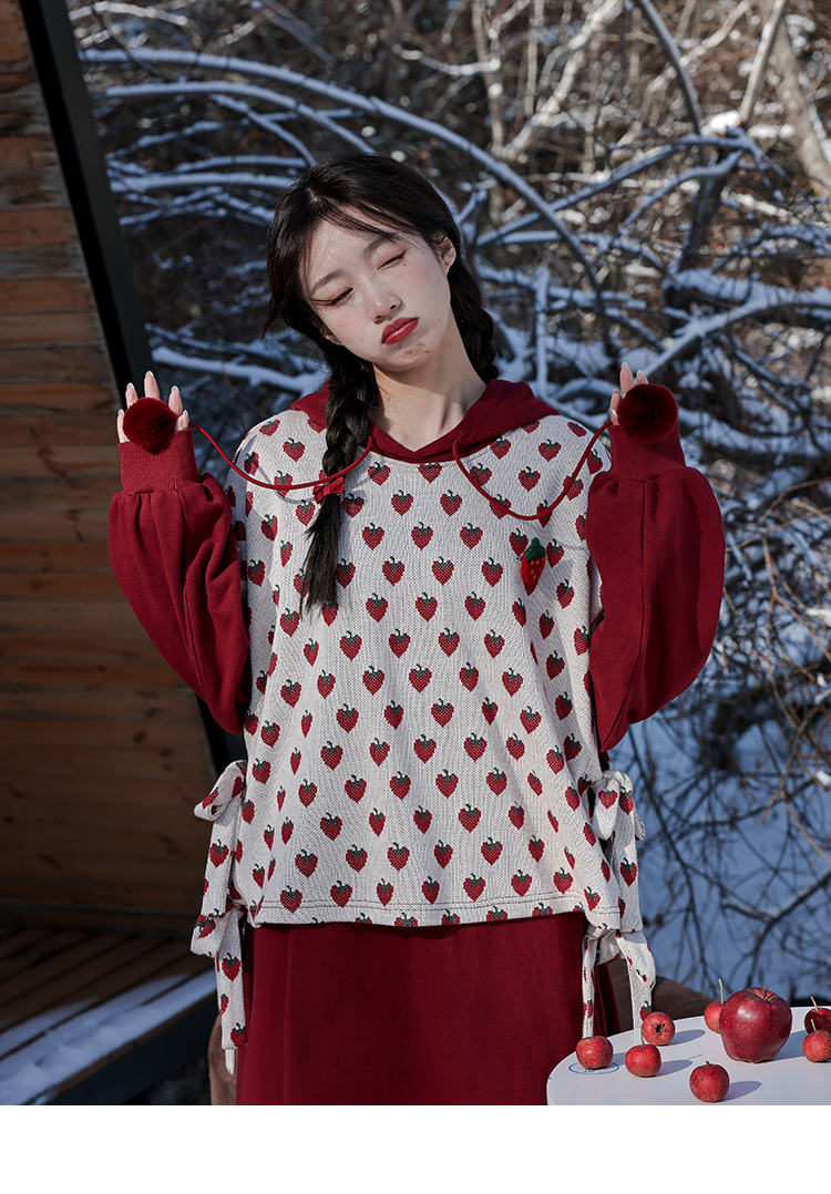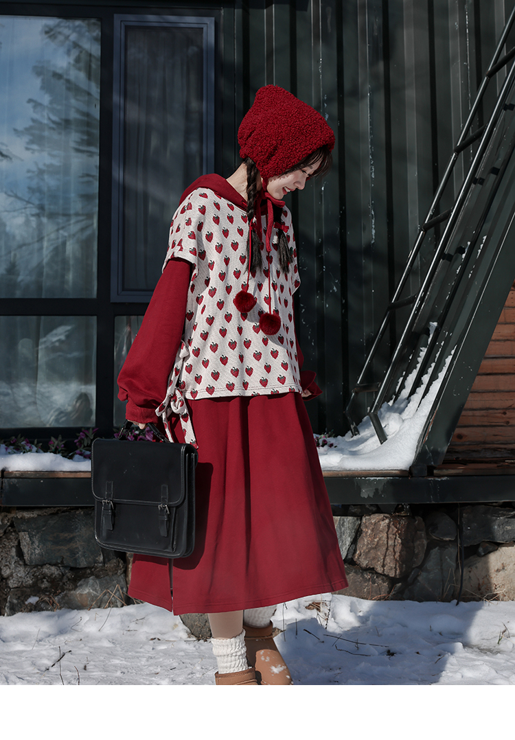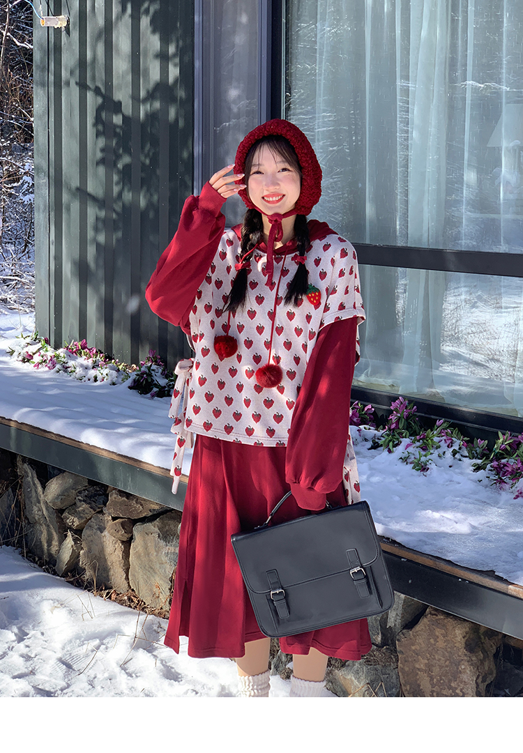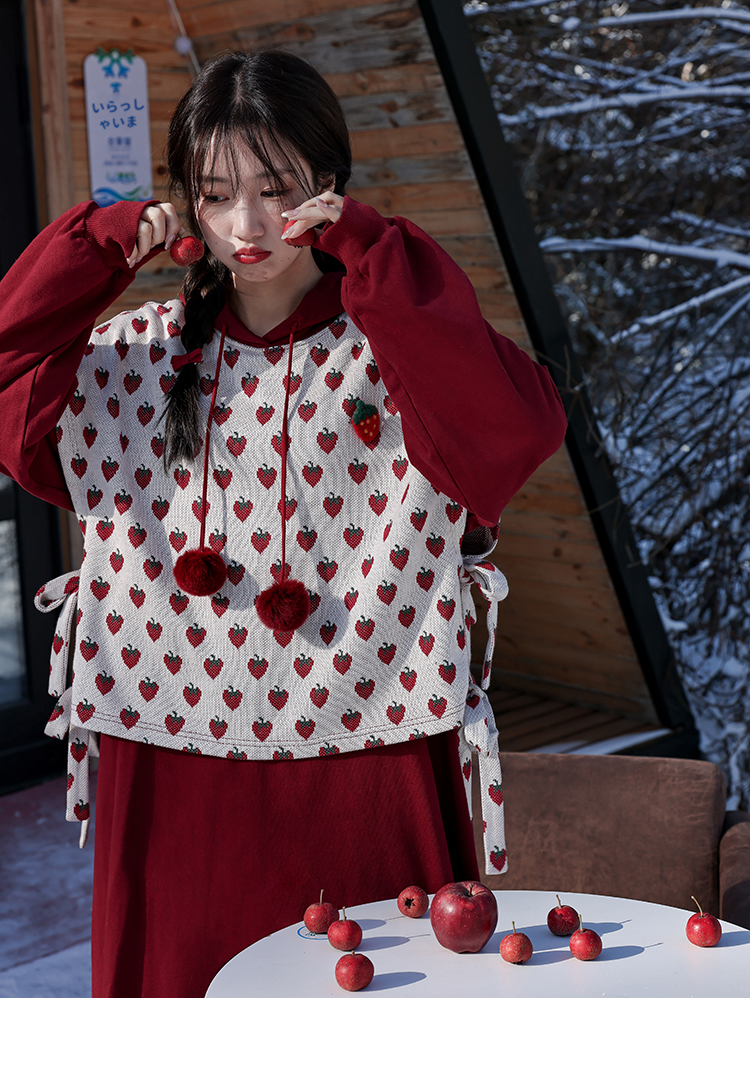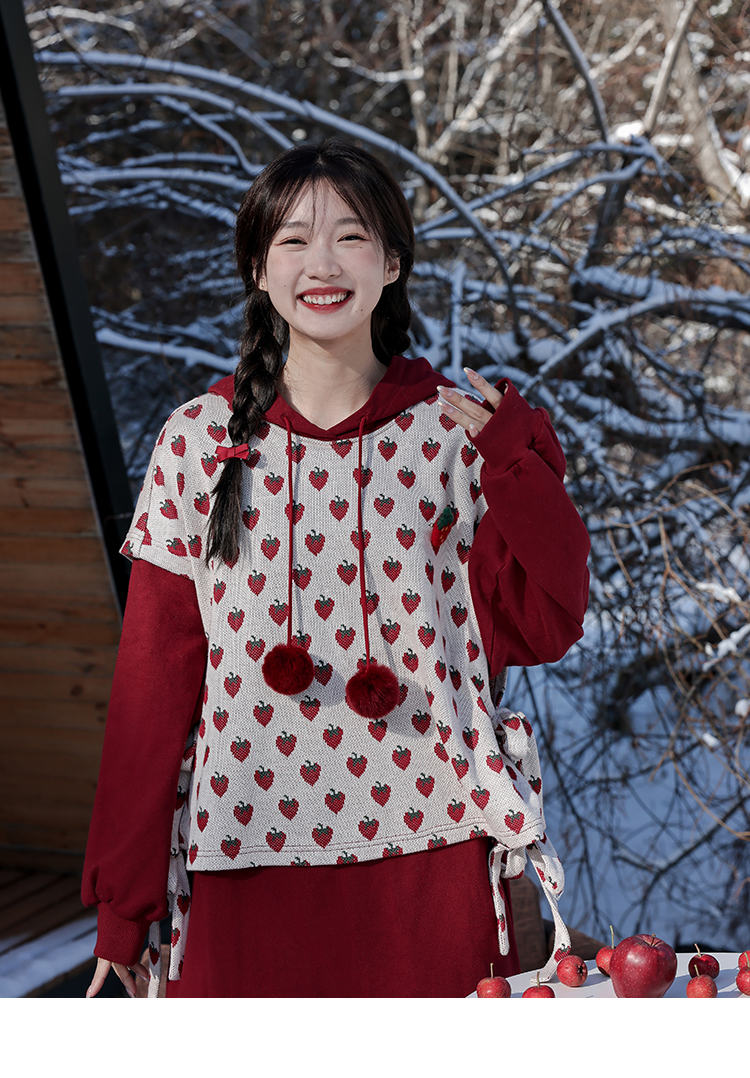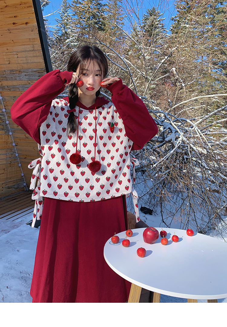 芝士日【草莓惑心】新年戰袍假兩件衛衣裙甜美連帽圣誕節連衣裙冬