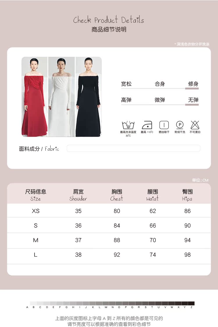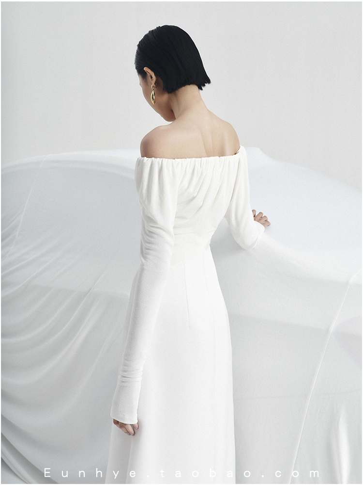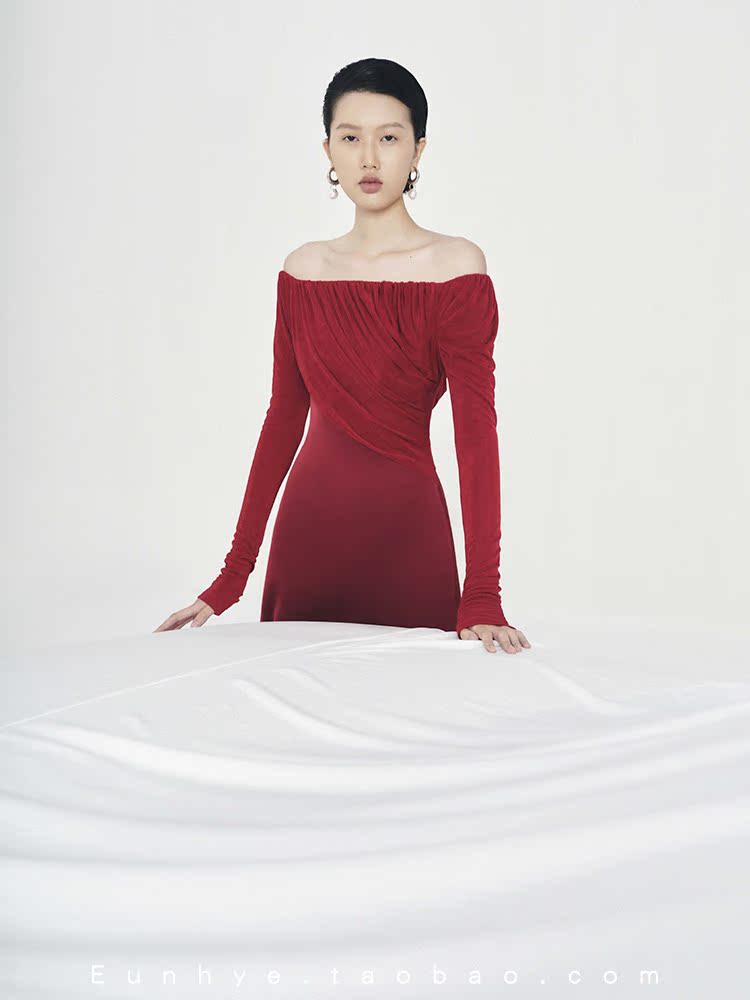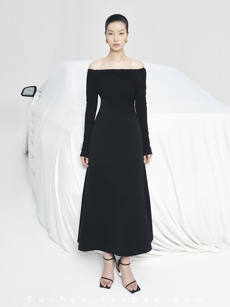 越南小眾設計師CHATS 2022冬季新款壓褶一字肩長袖傘擺修身連衣裙