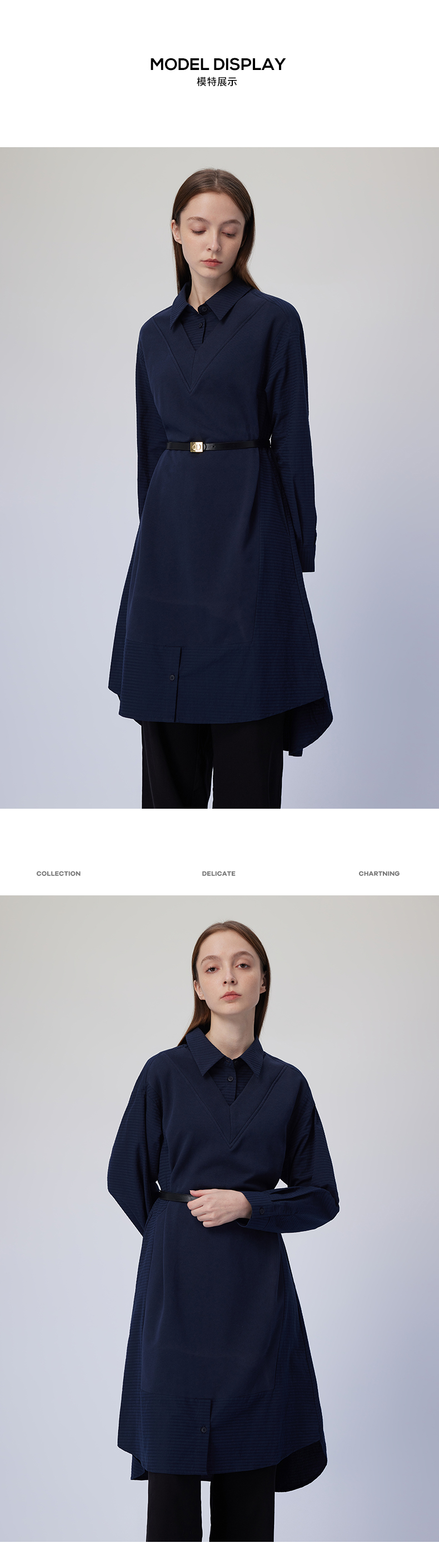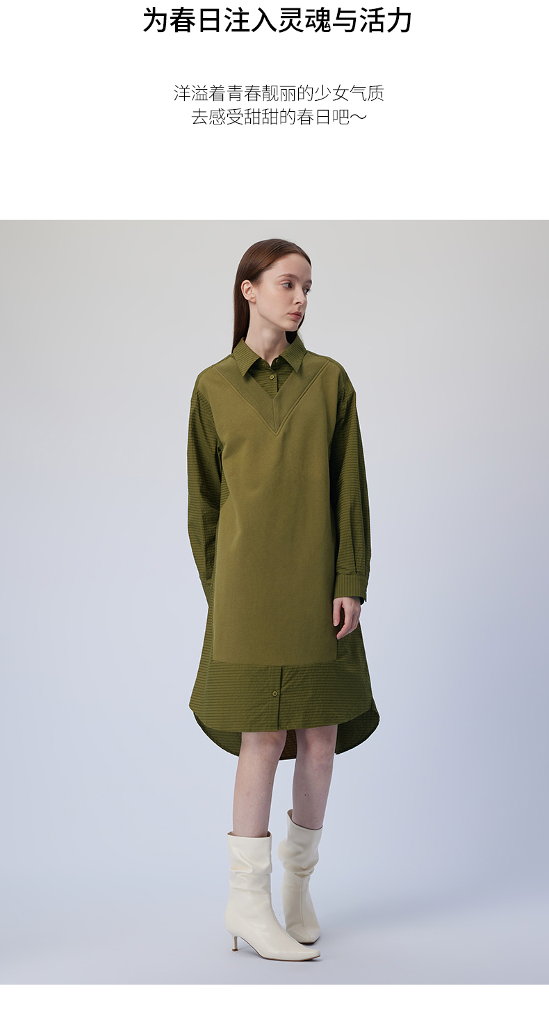 Basic House/百家好2023秋季新款拼接條紋襯衫裙收腰假兩件連衣裙