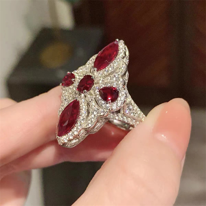 vintage鴿血紅彩寶超閃菱形戒指女 優雅氣質冷淡風指環時尚百搭款