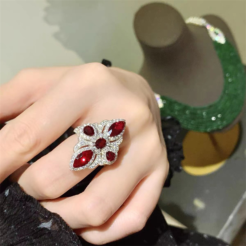 vintage彩寶璀璨紅寶石花朵戒指女ins潮開口食指環小眾高級感輕奢