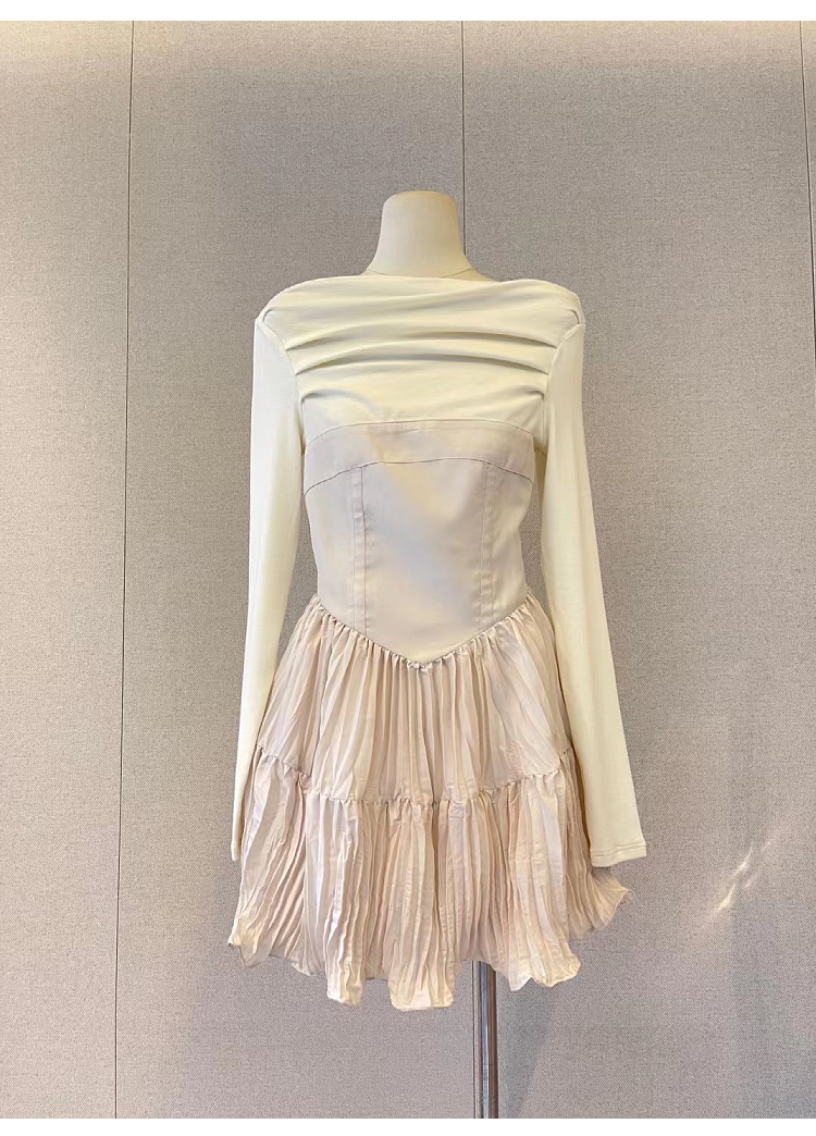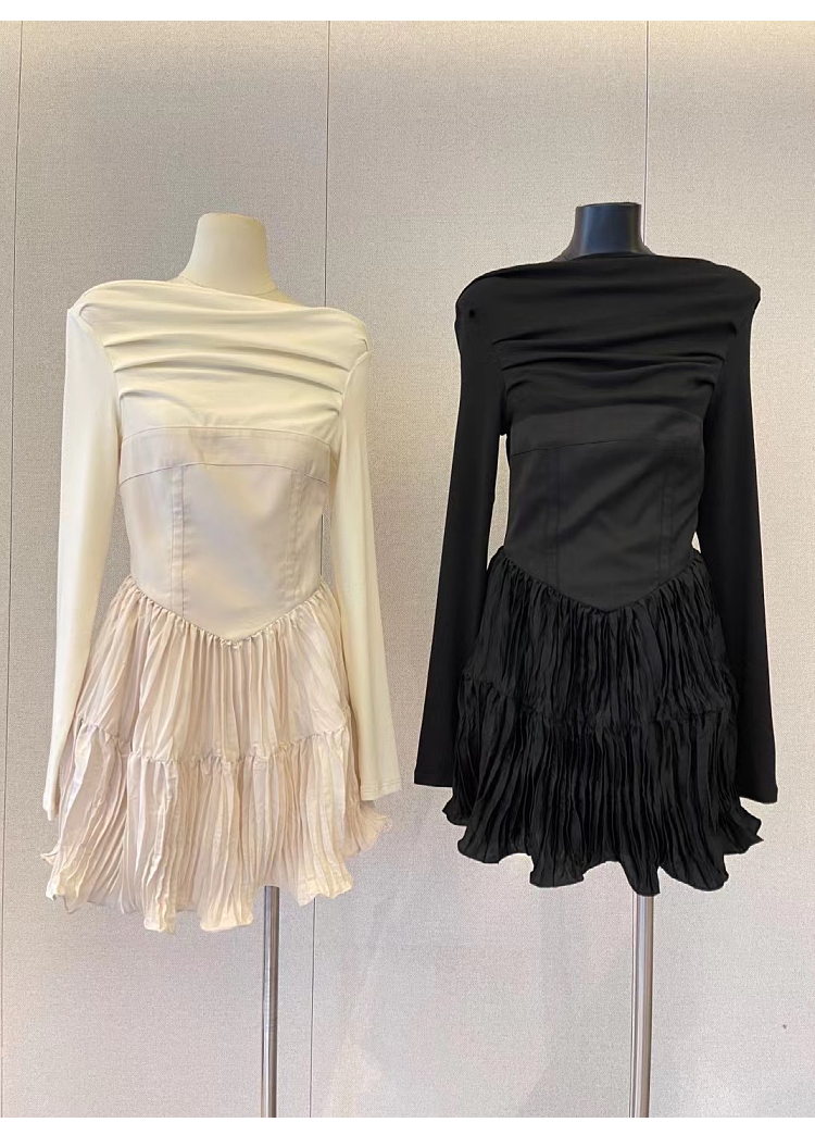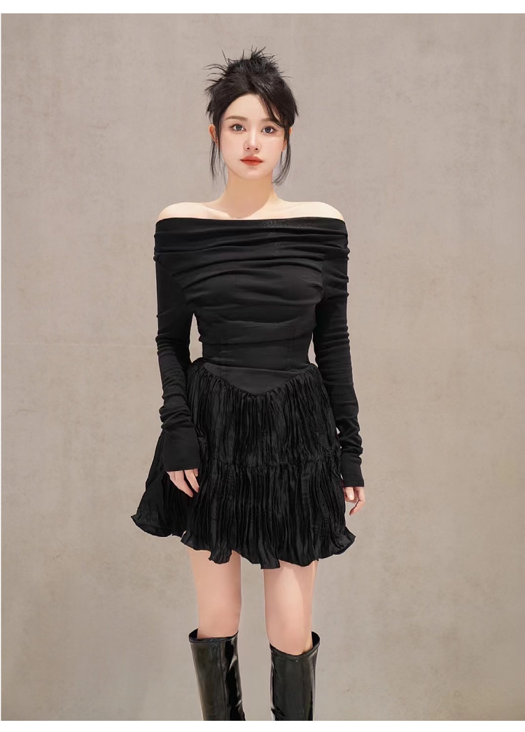 韓國小眾not&our新款長袖一字肩修身褶皺露肩性感連衣裙女