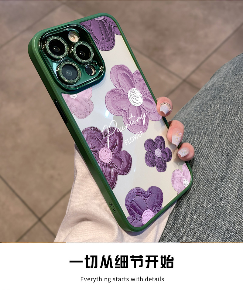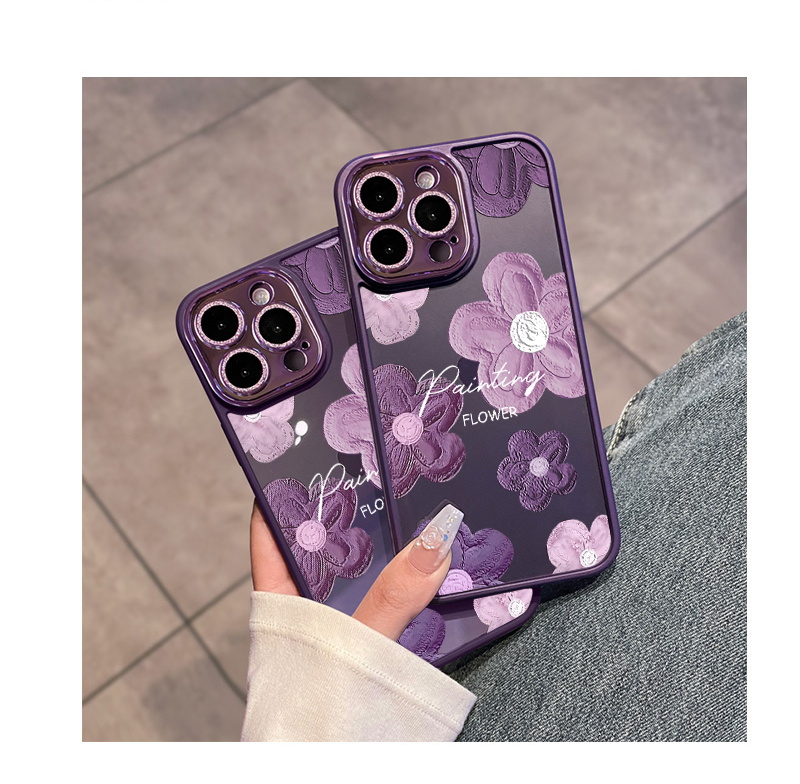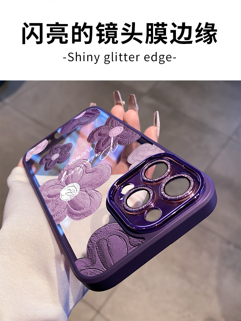 酷圖自帶鏡頭膜適用蘋果14promax手機殼新款暗紫色花朵蘋果iphone13保護套高級感閃粉12透明防摔plus女奢華11
