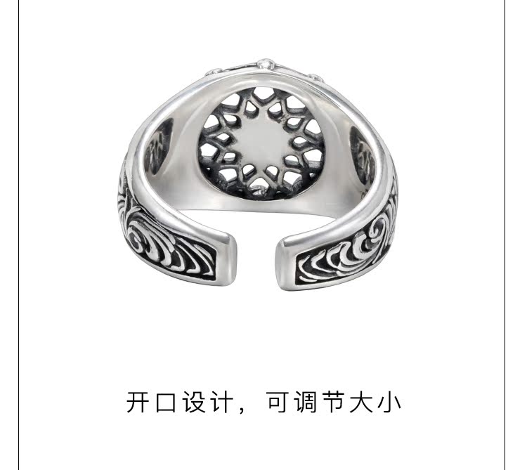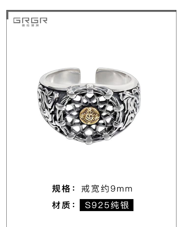 GRGR S925純銀唐草紋笑臉戒指男嘻哈復古小眾設計做舊款開口可調