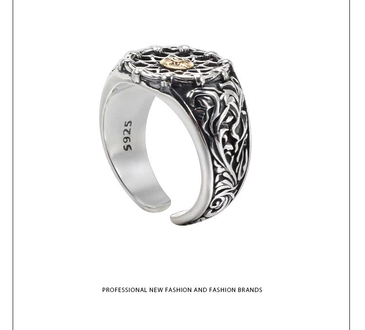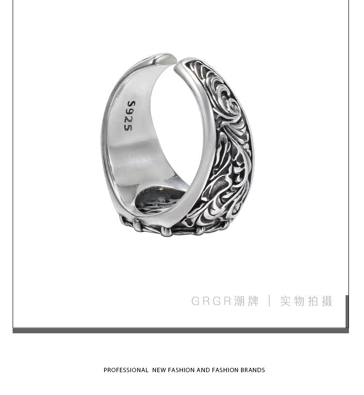 GRGR S925純銀唐草花紋纏繞戒指男女嘻哈復古潮ins情侶同款開口戒