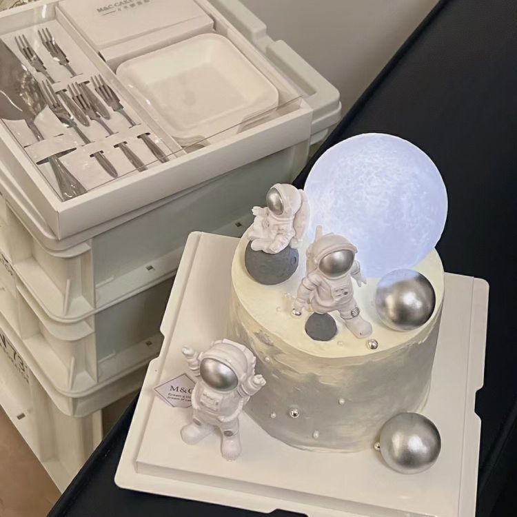 三款銀色宇航員蛋糕裝飾擺件圓月球燈男生主題生日宇宙插牌插件