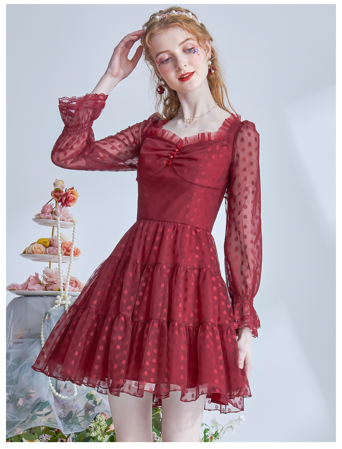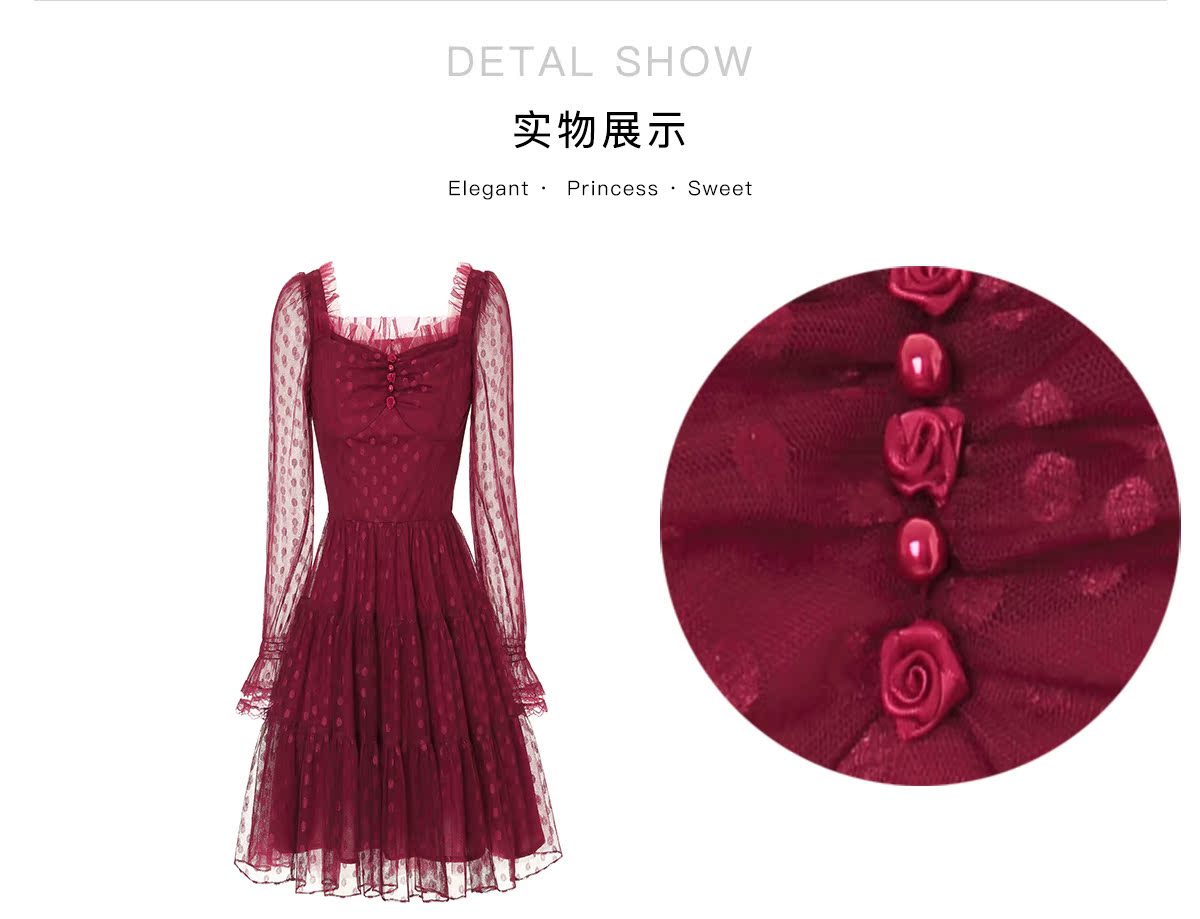 艾麗絲紅色新年連衣裙女2023秋季新款網紗波點方領修身短款公主裙
