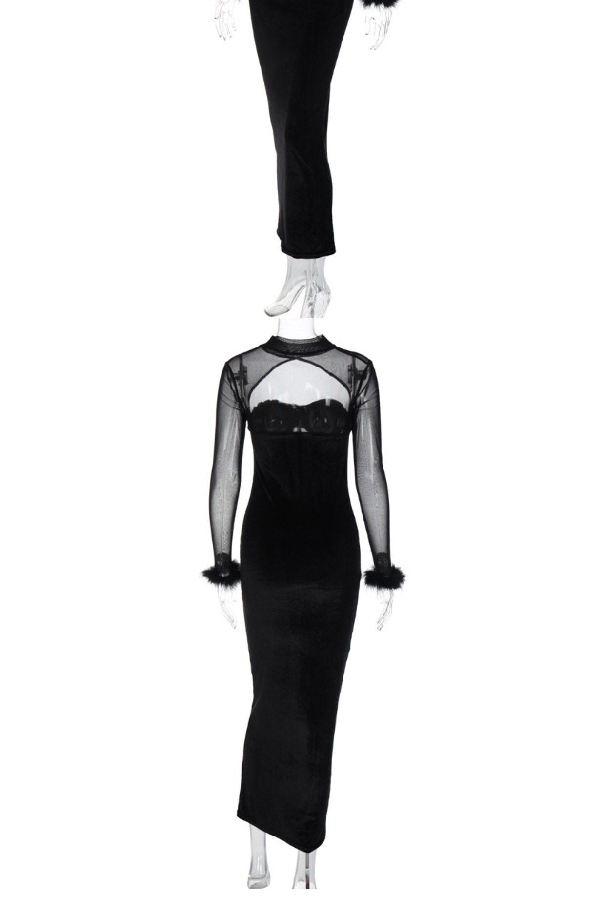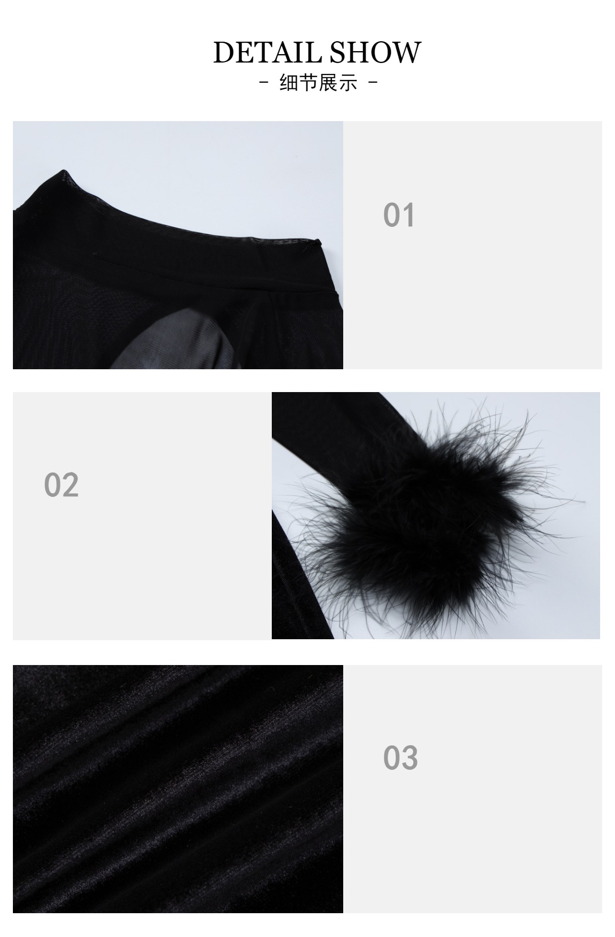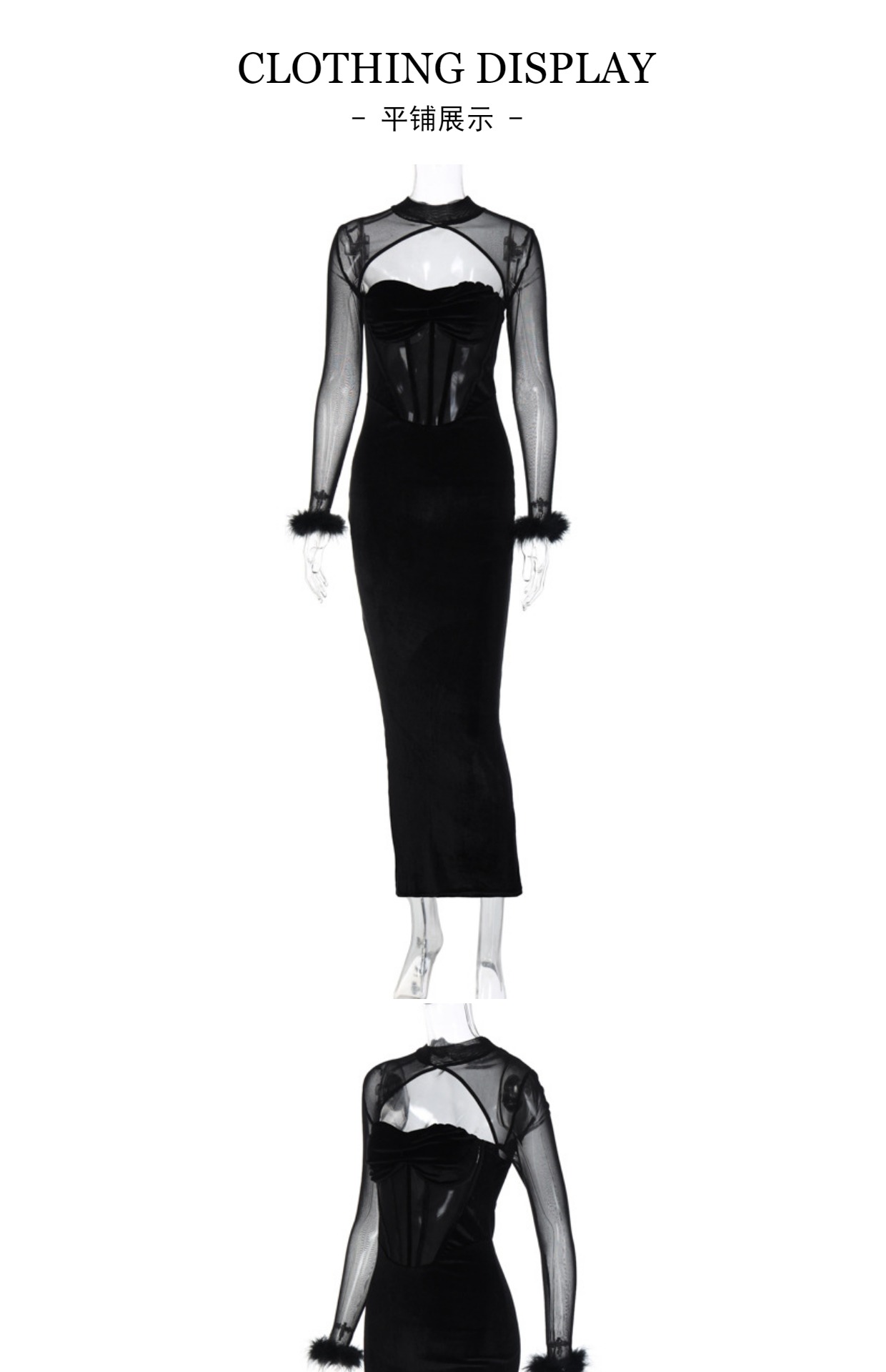 歐美秋冬新款毛毛長袖塑腰連衣裙魚骨設計拼接網紗修身純色打底裙