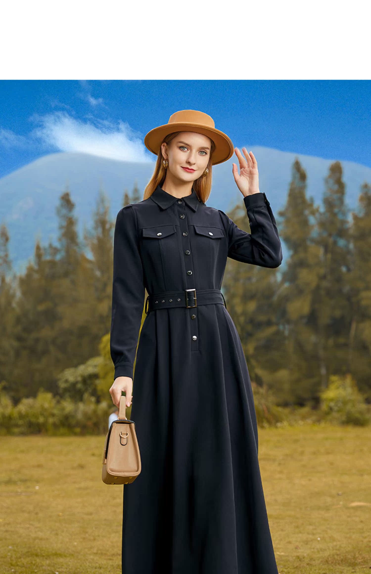 帝弗潤馳長袖氣質藏青色春季連衣裙