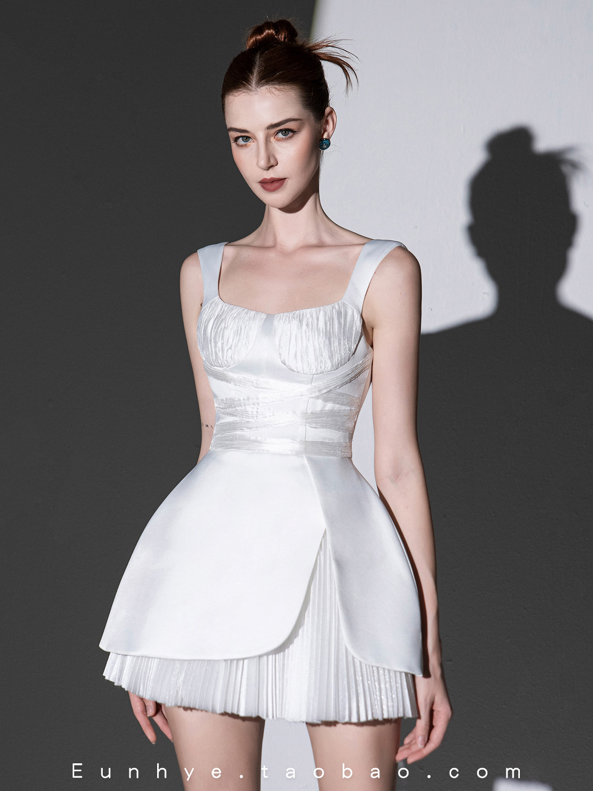 品牌授權越南小眾CICI 2023新年新款光澤緞面微褶綁帶收腰吊帶裙