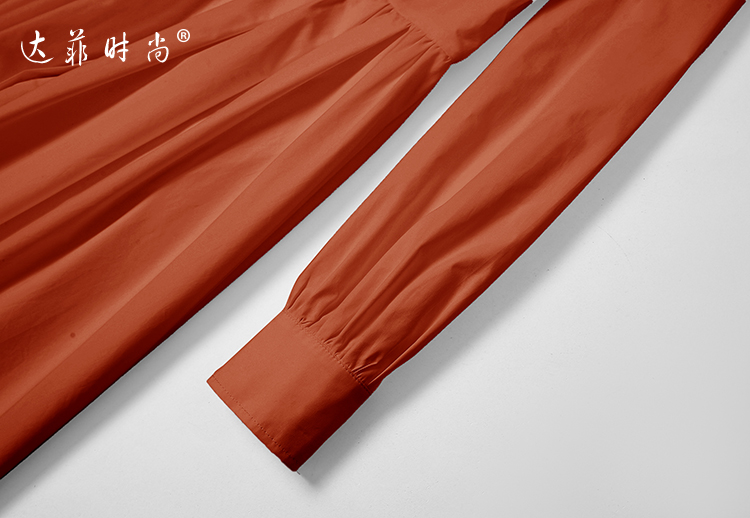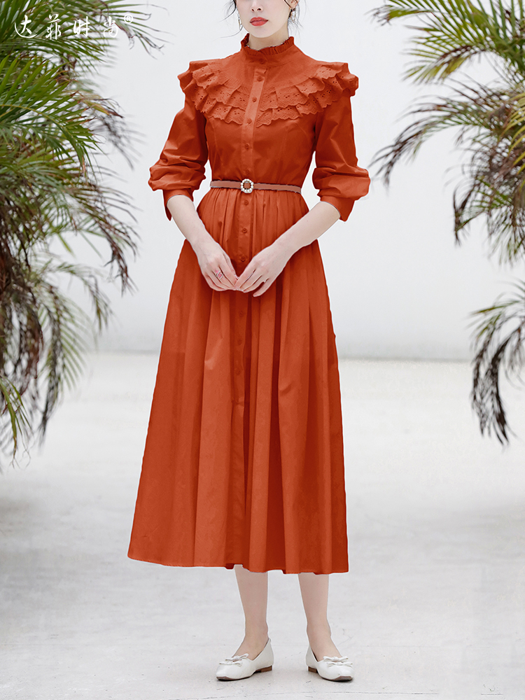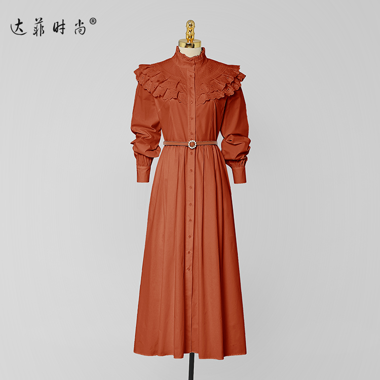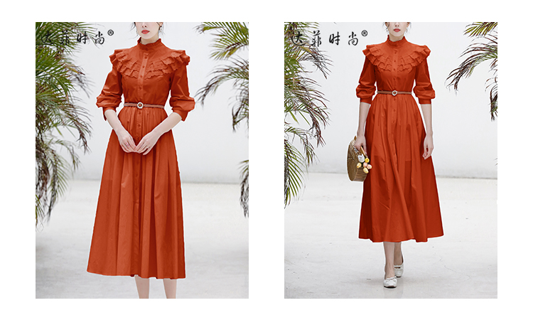 秋裝女裝2023新款氣質橘紅色荷葉邊收腰顯瘦襯衫連衣裙長裙女