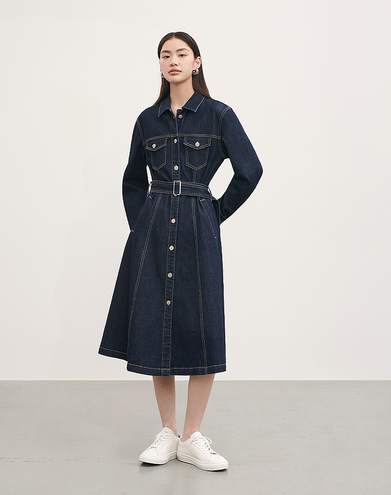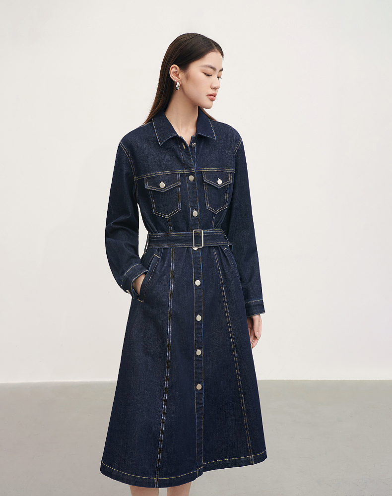 商場同款naivee納薇23夏新款復古靛藍直身收腰牛仔長袖腰帶連衣裙