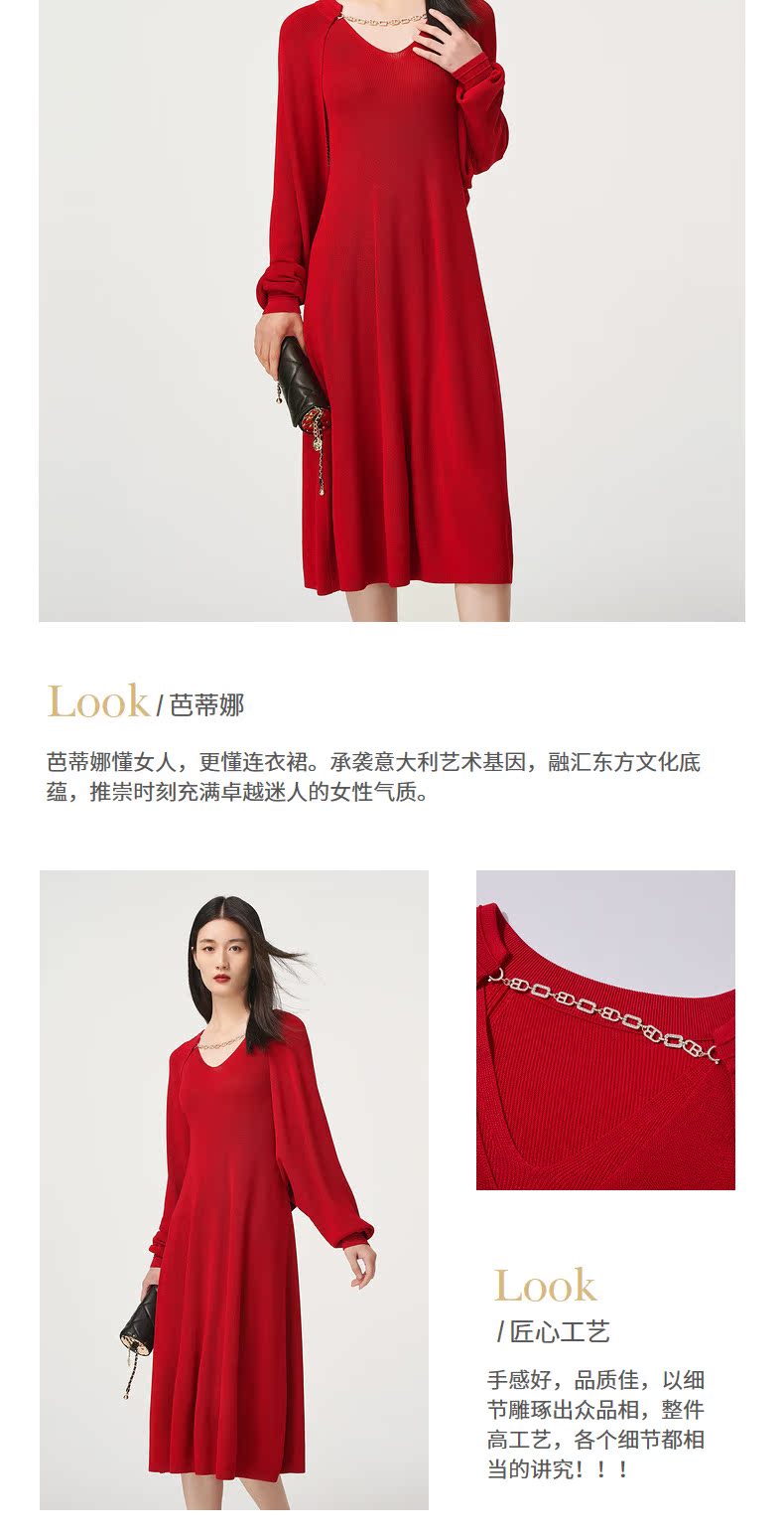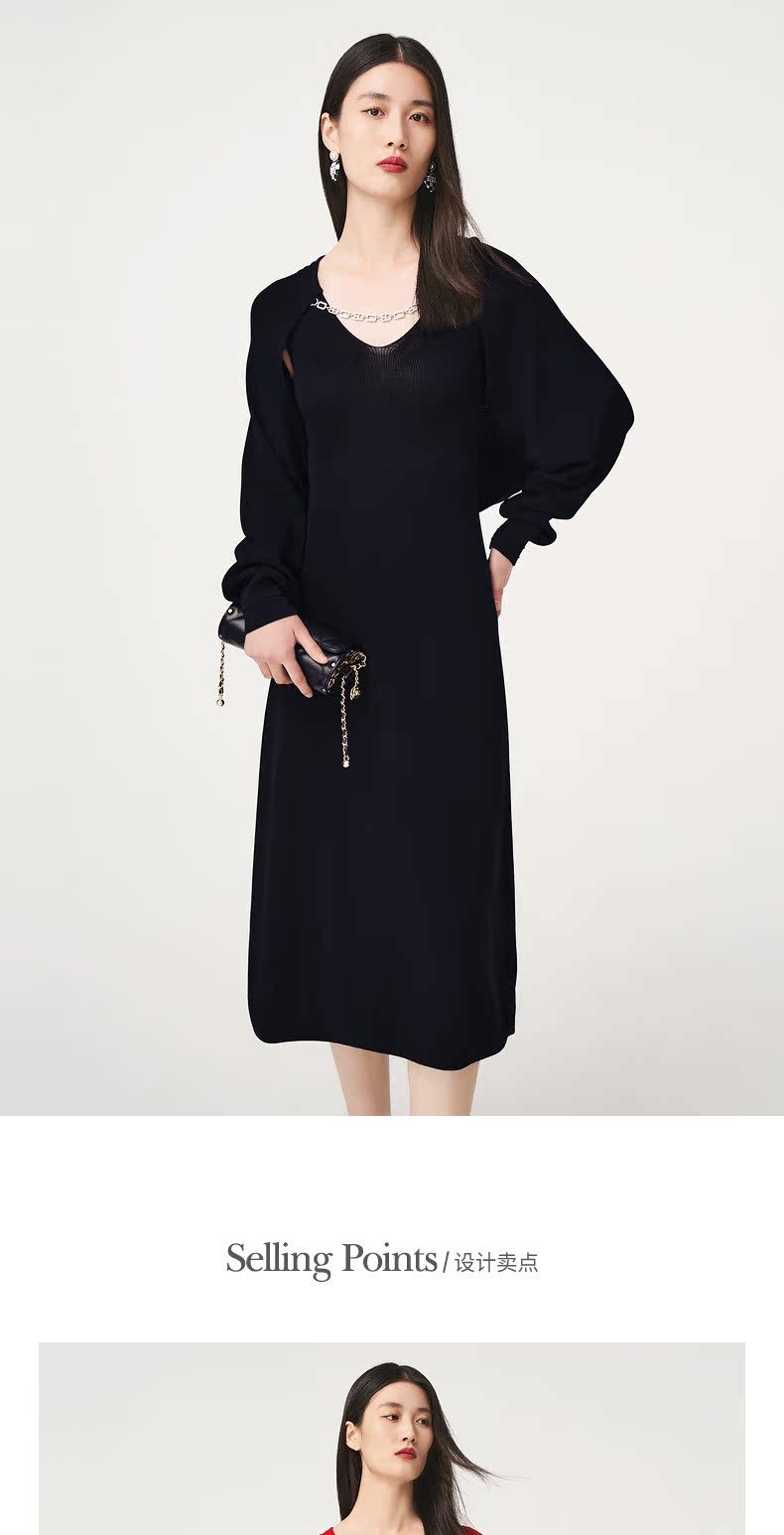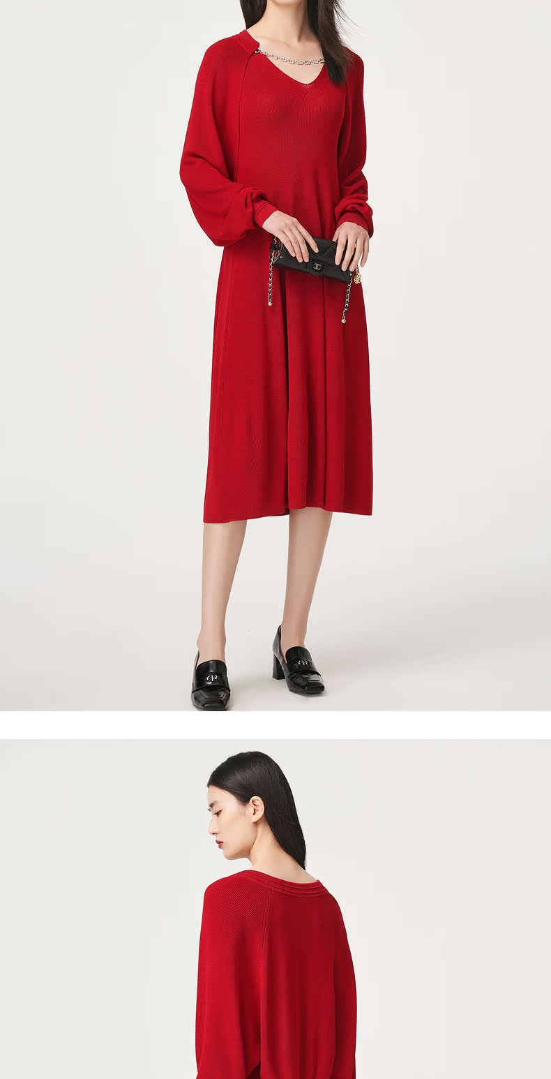 【專柜同款】秋冬優雅氣質V領長袖羊毛針織連衣裙