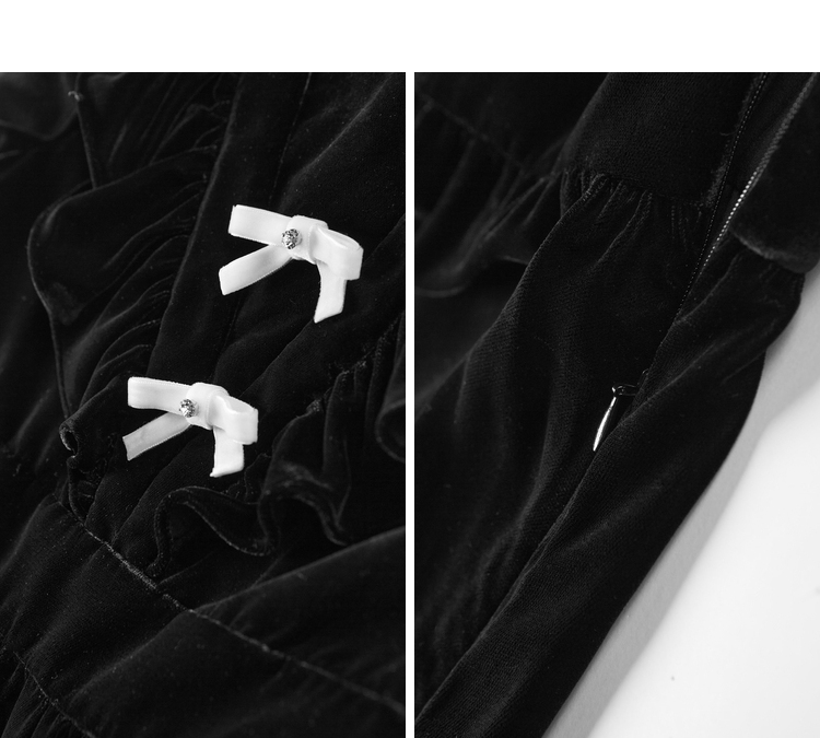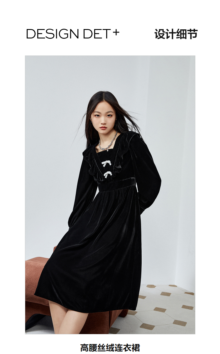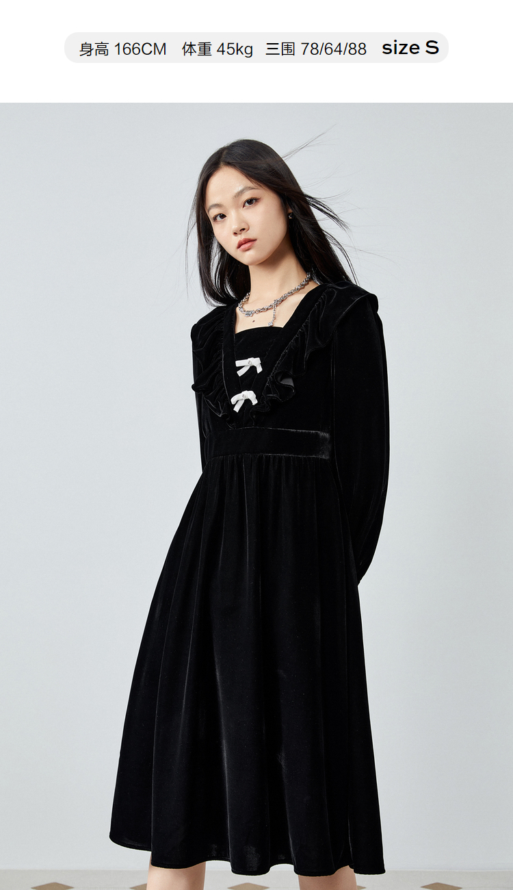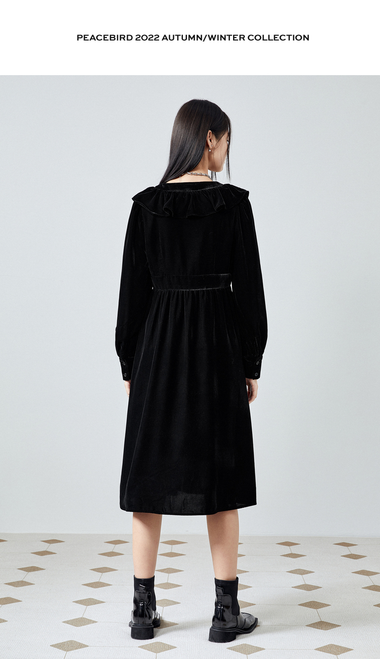 太平鳥絲絨連衣裙女秋冬新款黑色荷葉邊連衣裙小黑裙長袖長裙