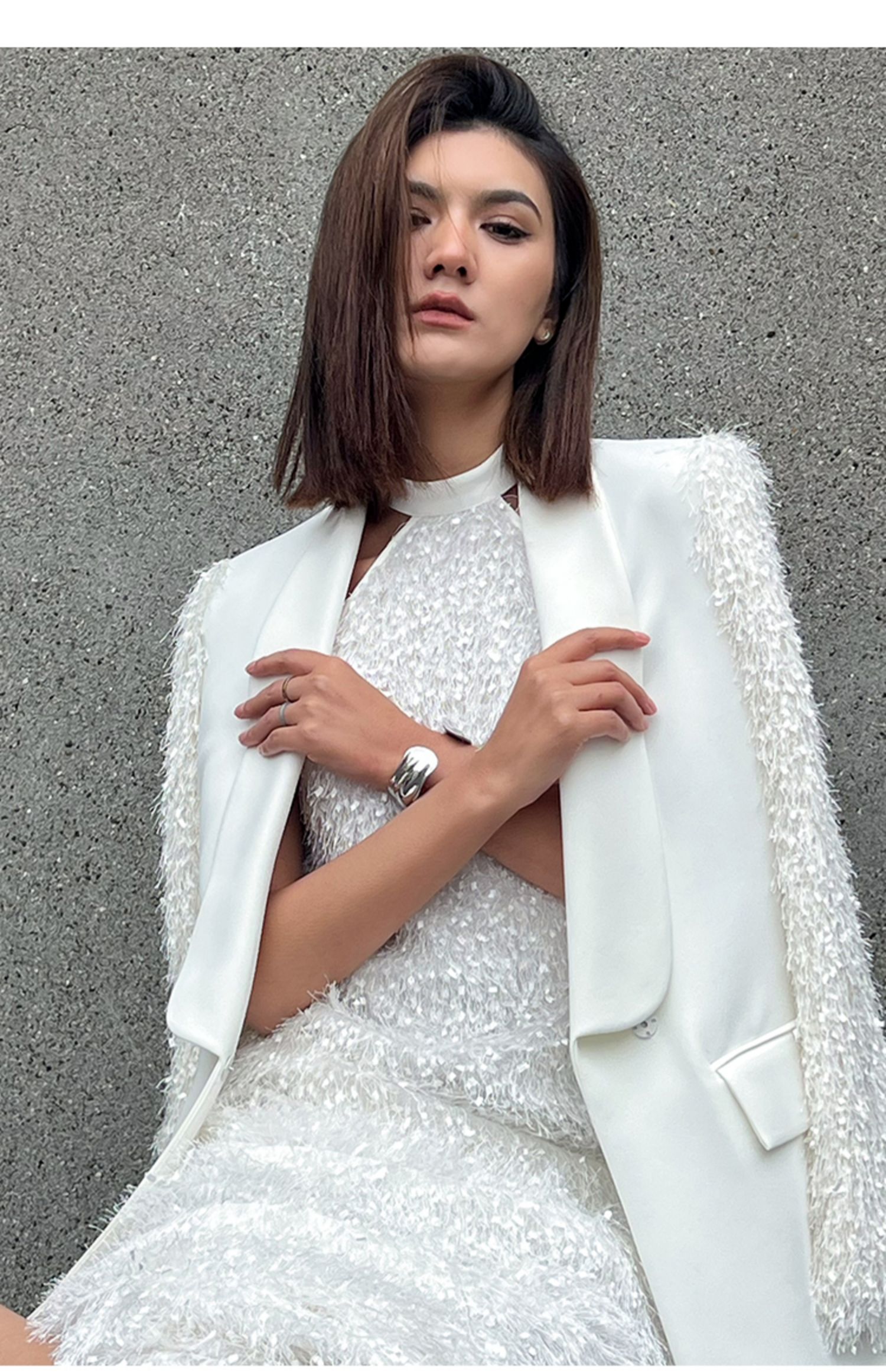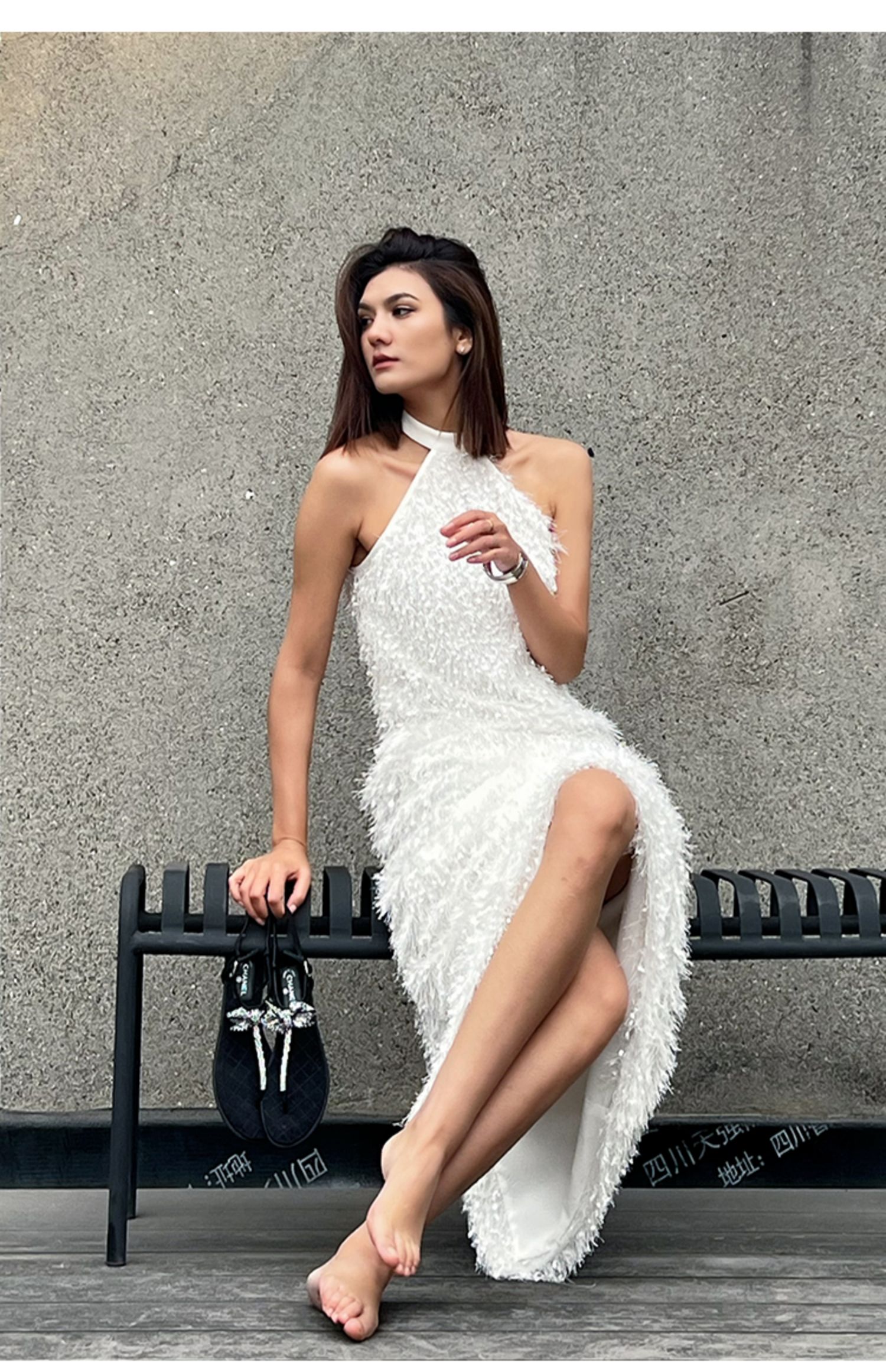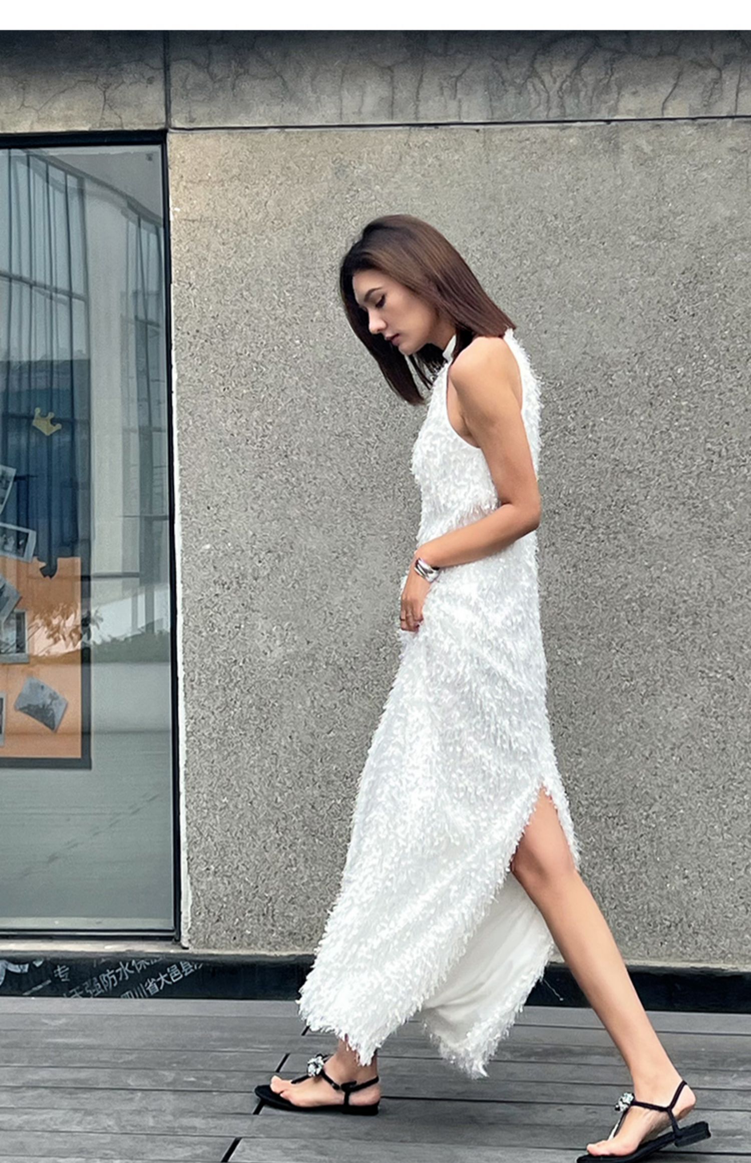 LEDIM WANG設計感白色連衣裙夏女流蘇掛脖長裙高級感顯瘦海邊度假