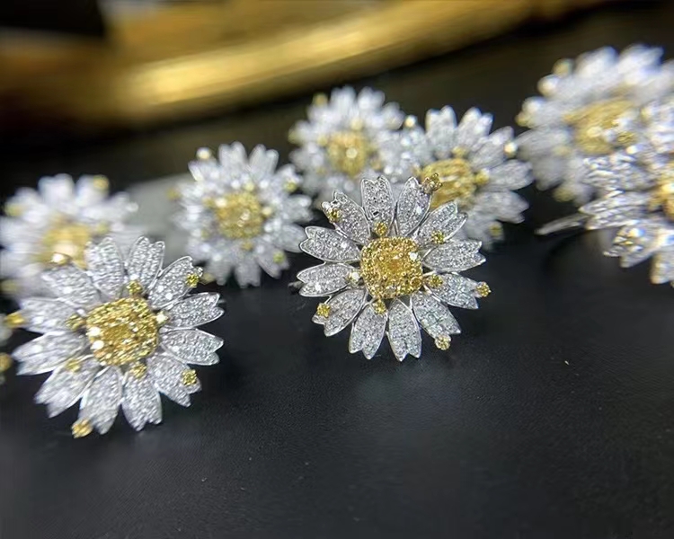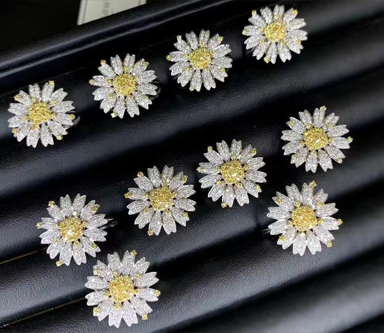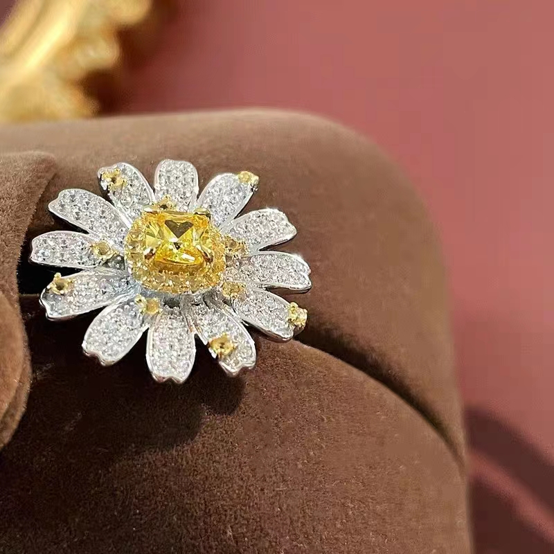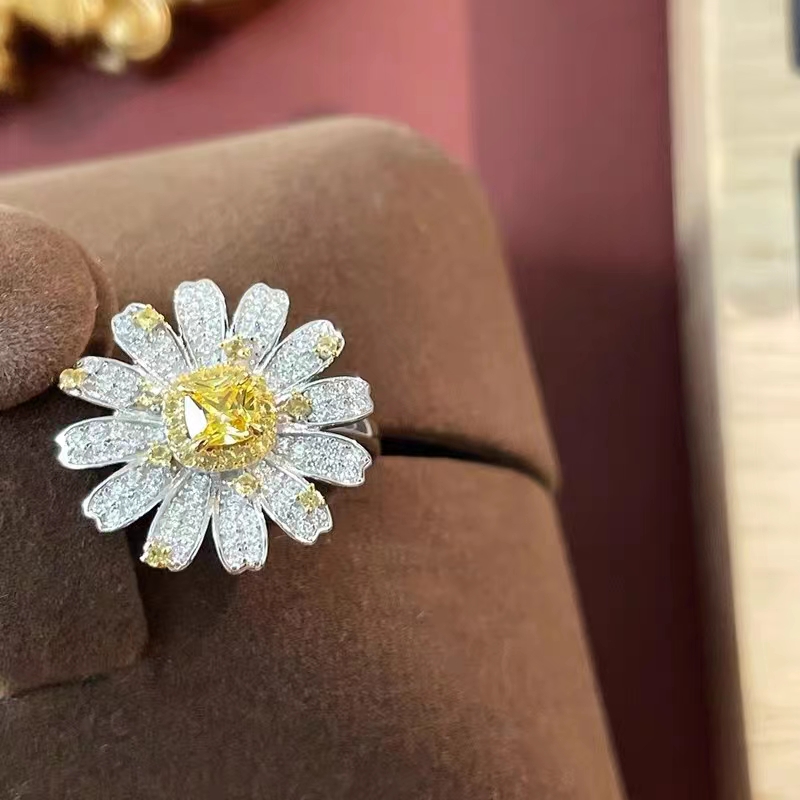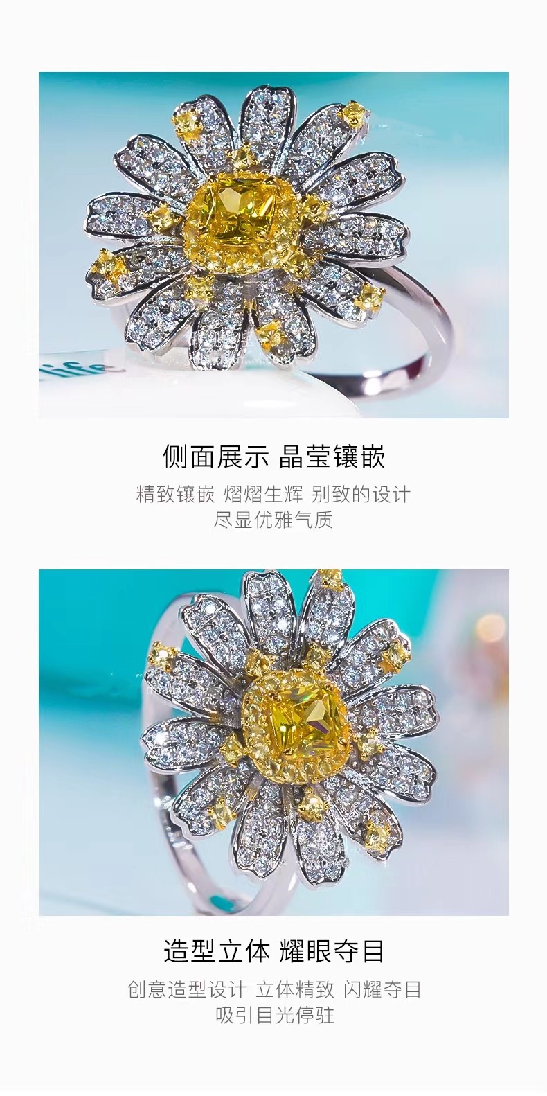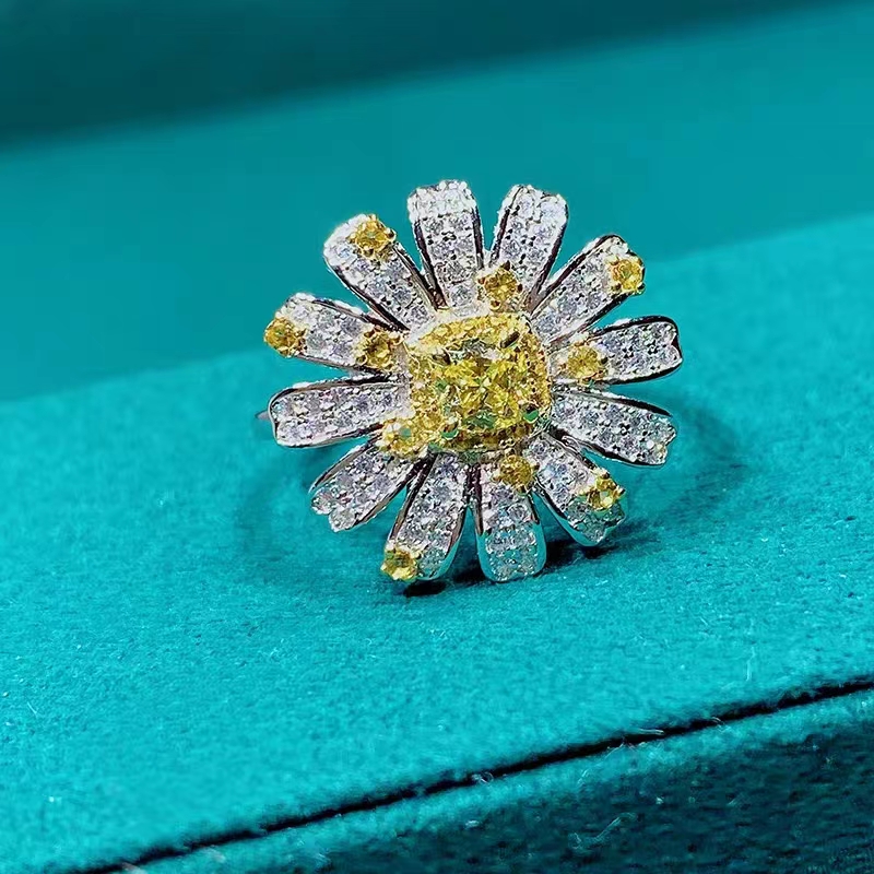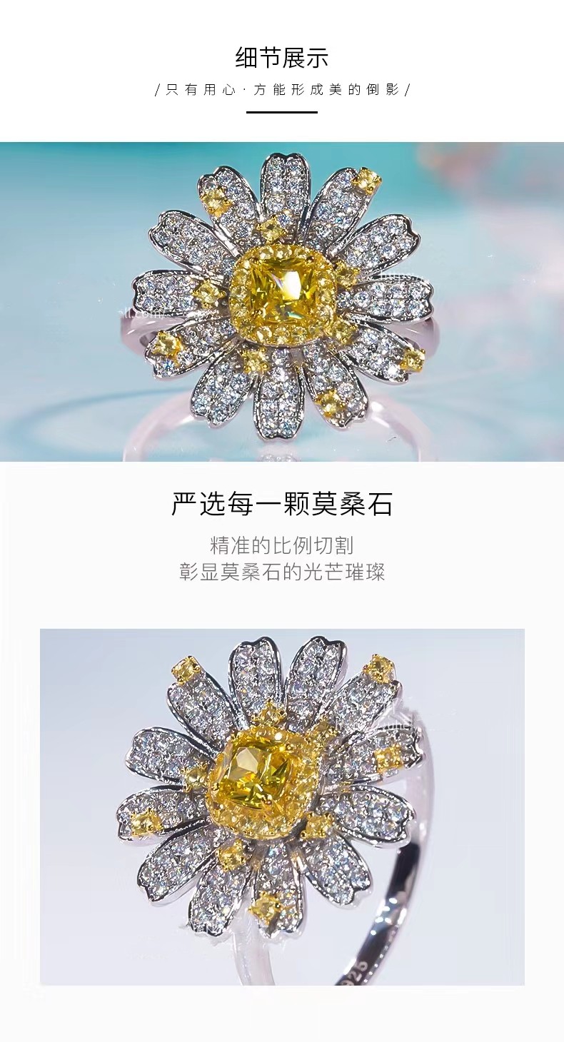 PT950鉑金進口D色莫桑石黃鉆雛菊戒指簡約小眾不掉色食指指環女新