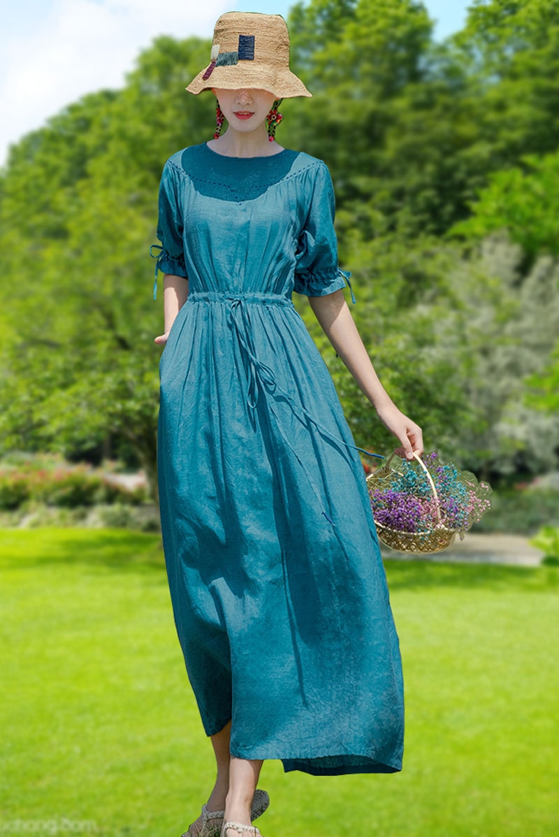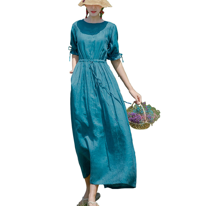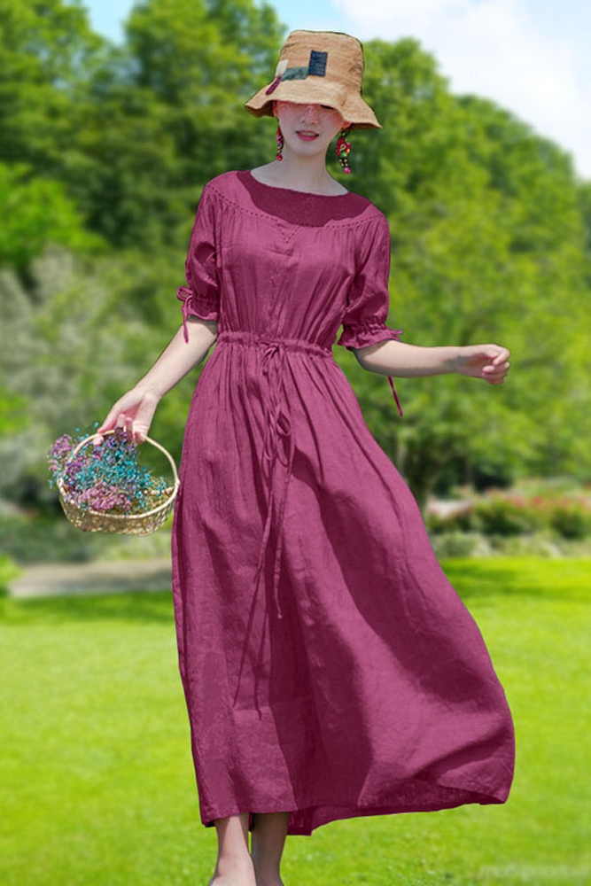 文藝范酒紅色純亞麻連衣裙女2023春夏季新款高端原創復古棉麻長裙