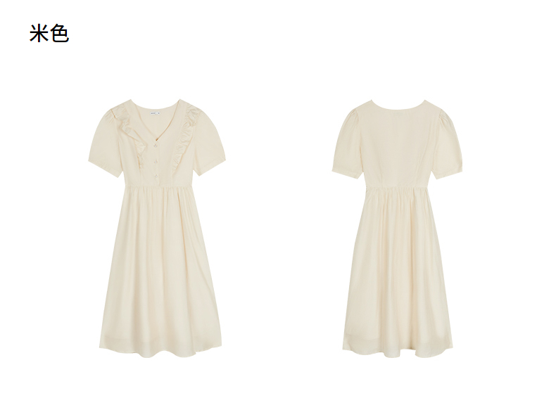 熱風2023年夏季新款女士荷葉邊V領泡泡袖連衣裙甜美減齡中長裙