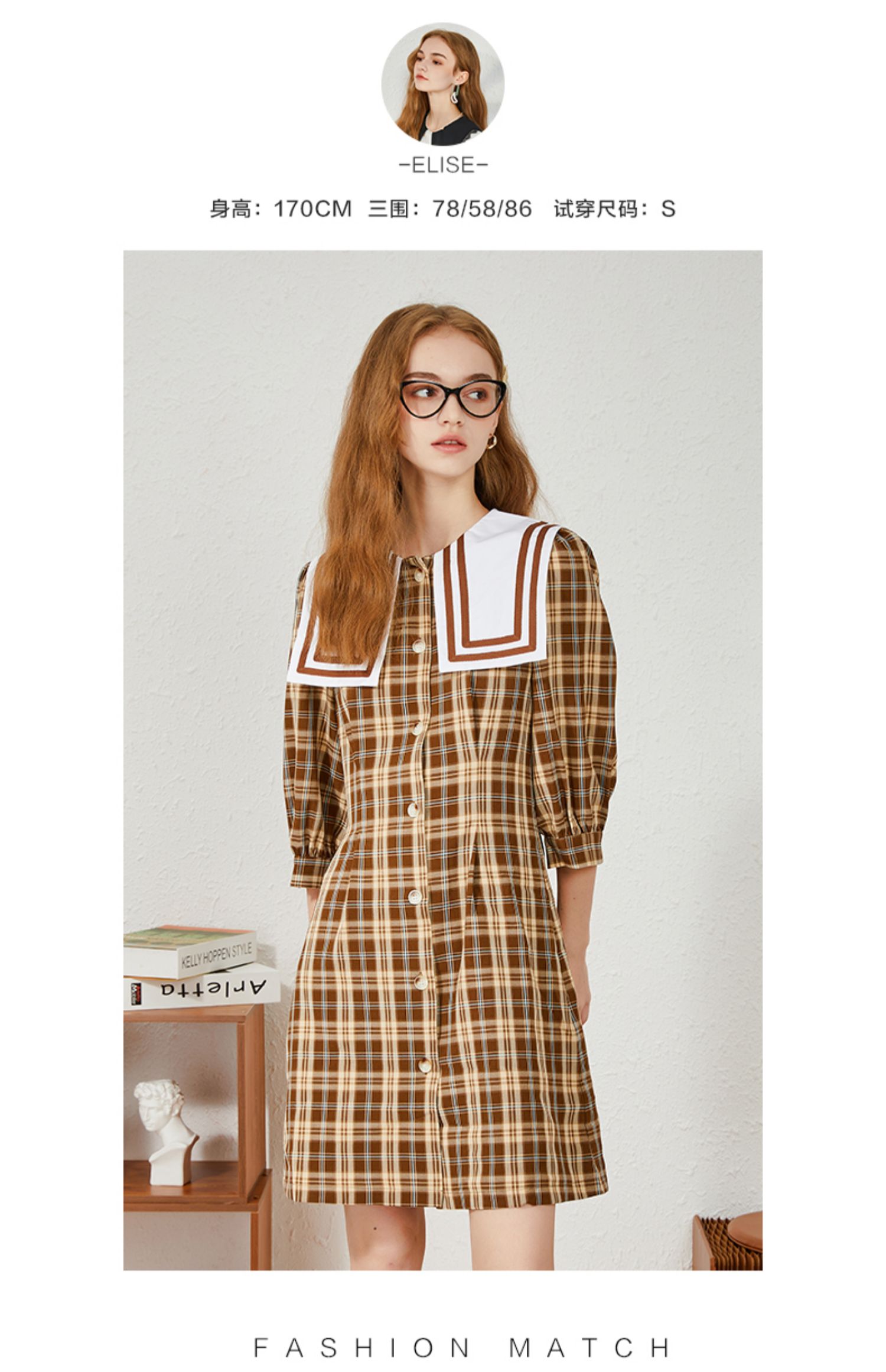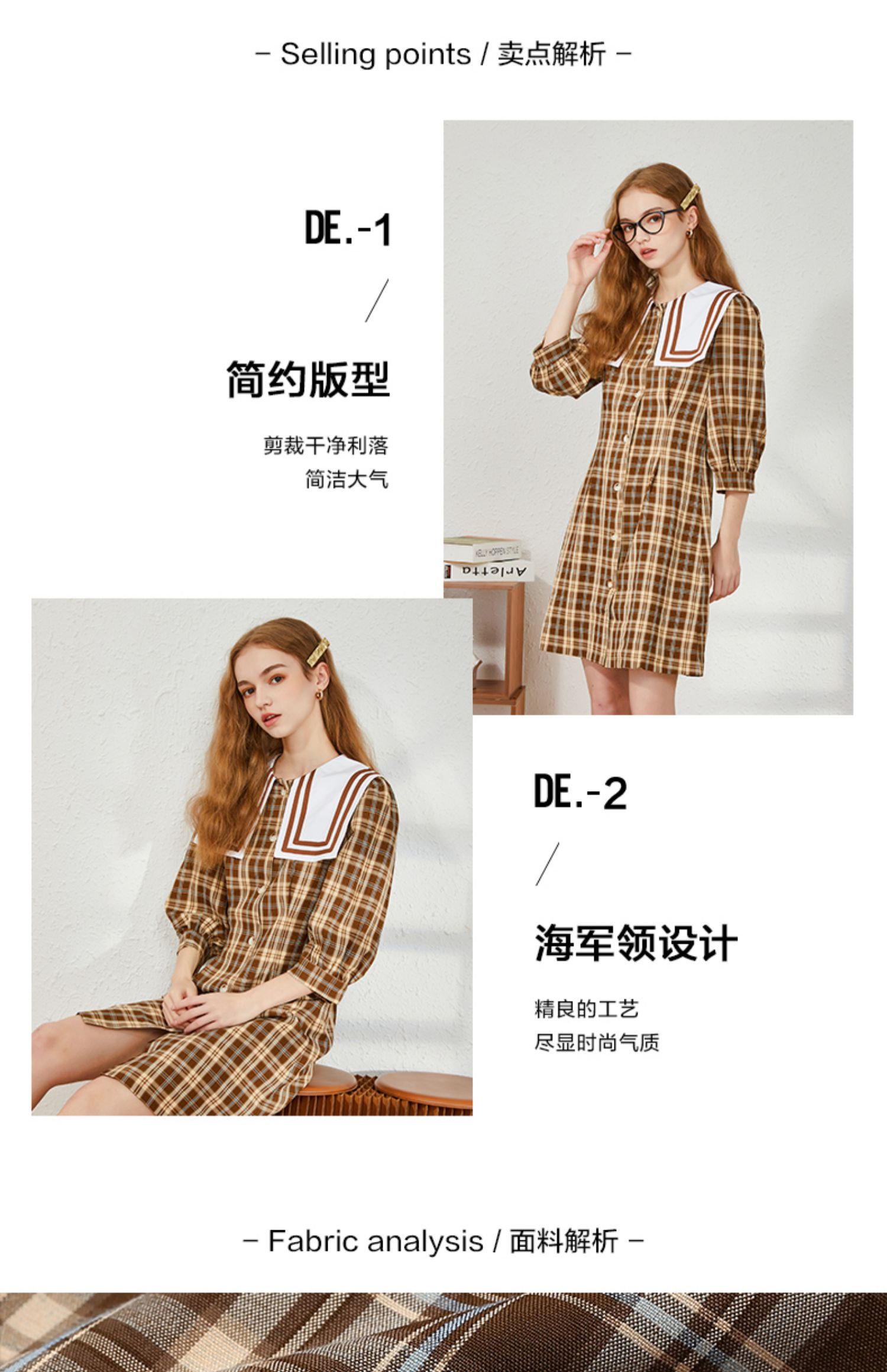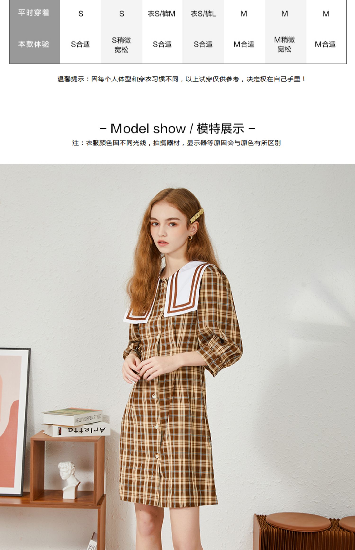 DOOC連衣裙女2023春季新款海軍領格子A字裙收腰高級裙子減齡