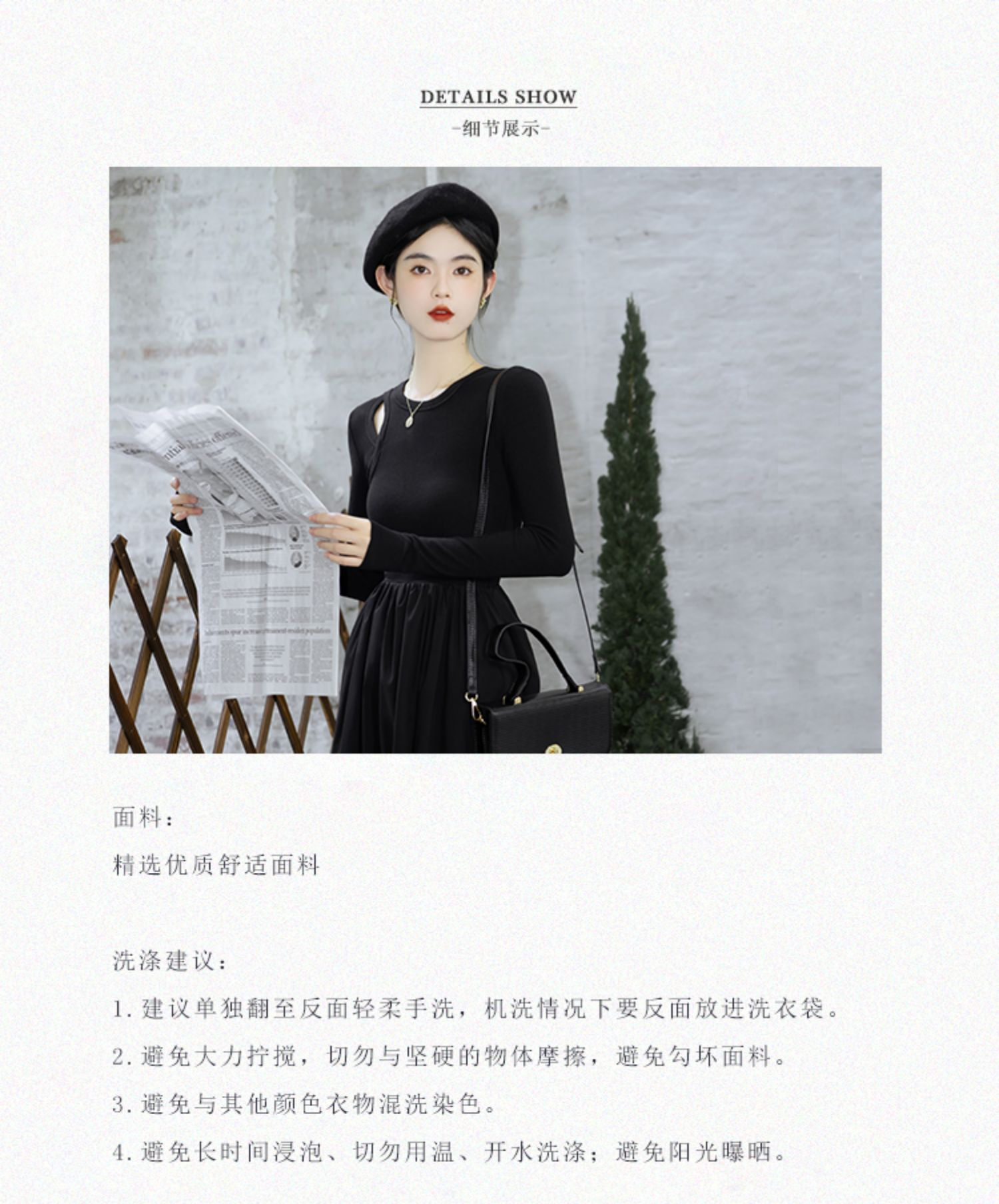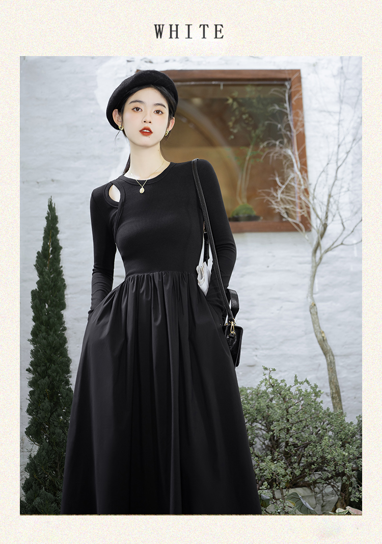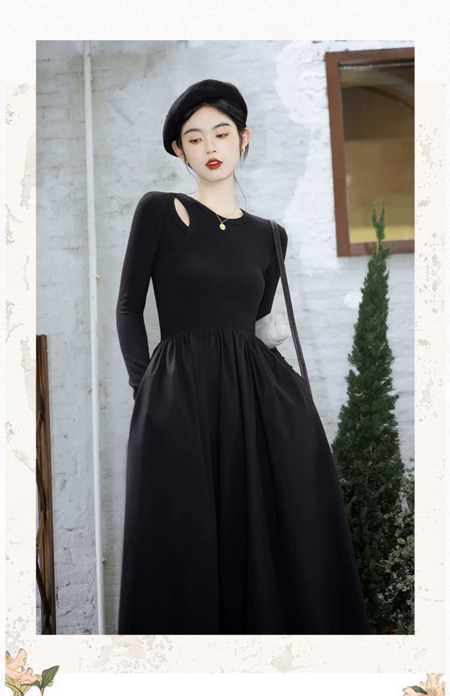 法式復古赫本風小黑裙黑色針織拼接連衣裙秋季穿搭高級感顯瘦長裙