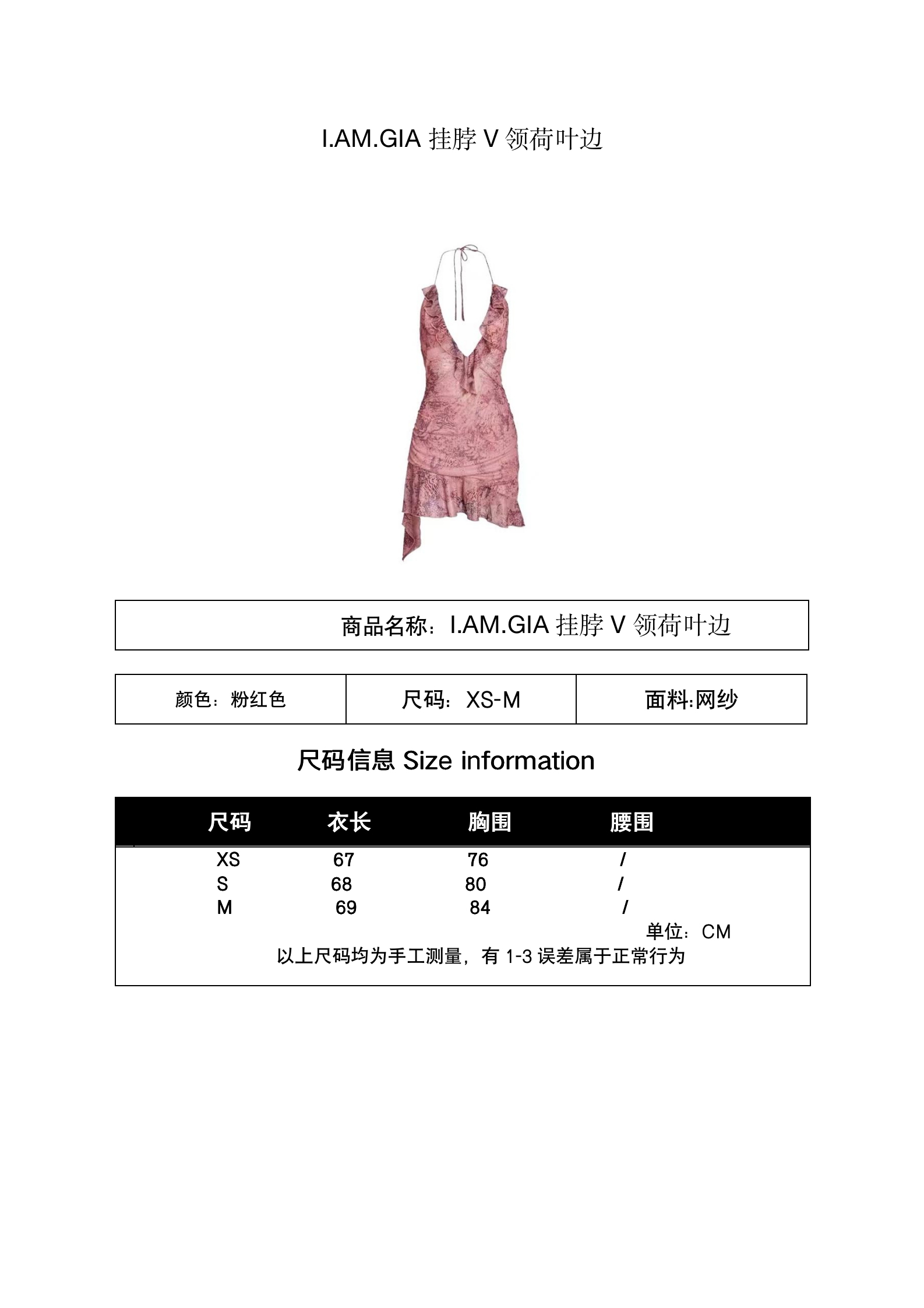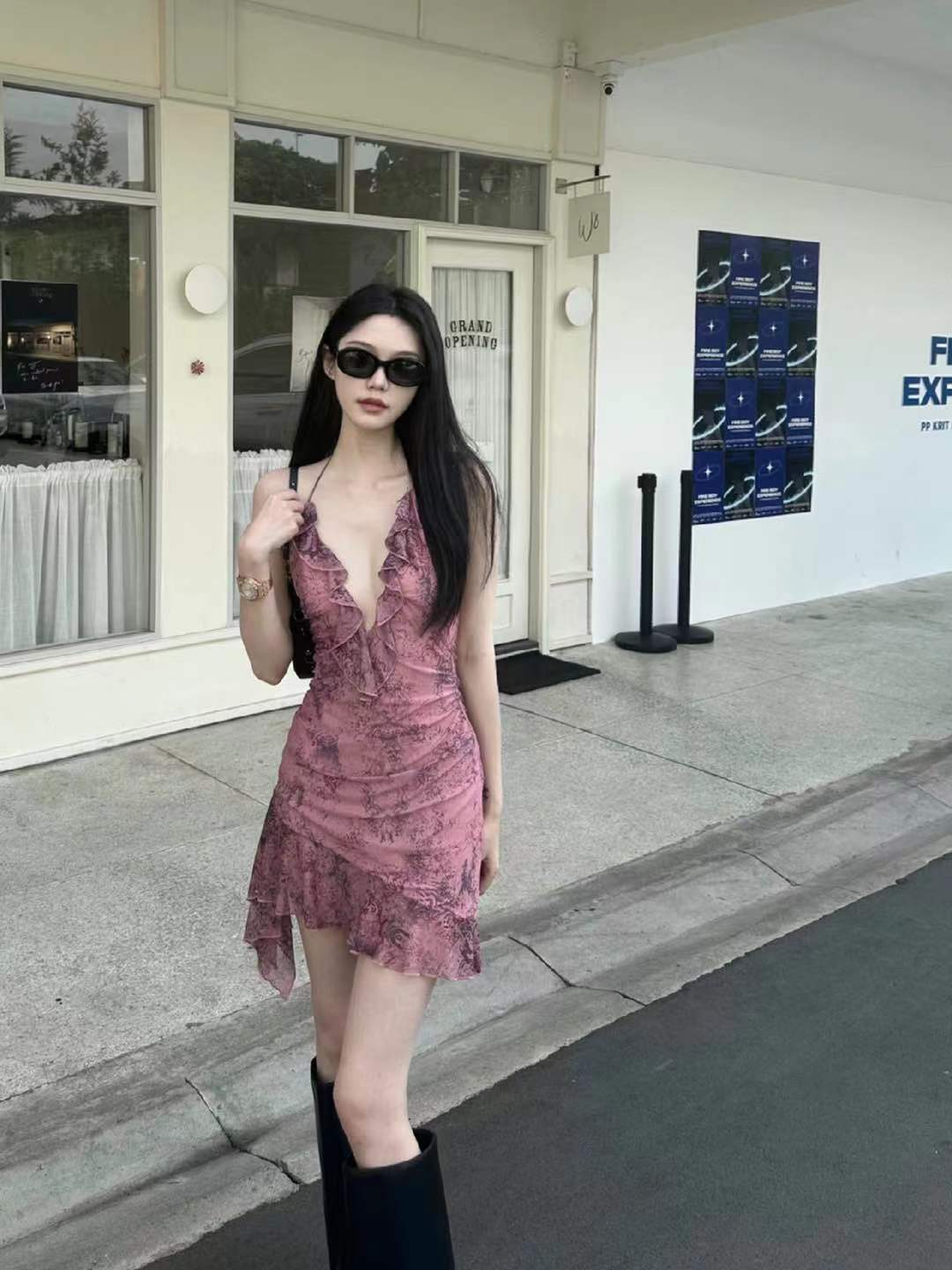 IAMGIA美式性感辣妹印花V領不規則吊帶連衣裙露背褶皺荷葉綁帶裙