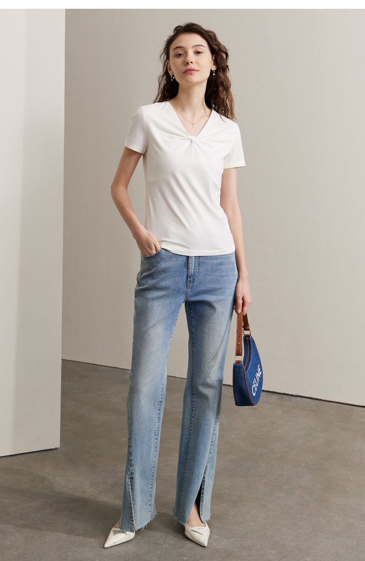 Amii2023夏新款極簡純色修身短袖套頭V領莫代爾棉上衣T恤女