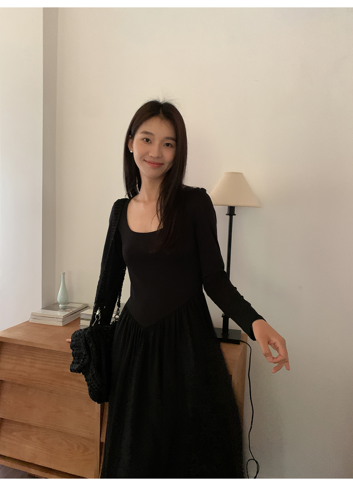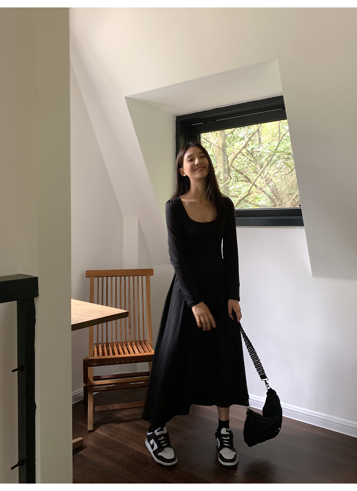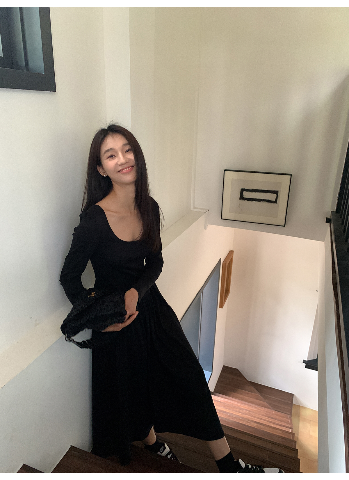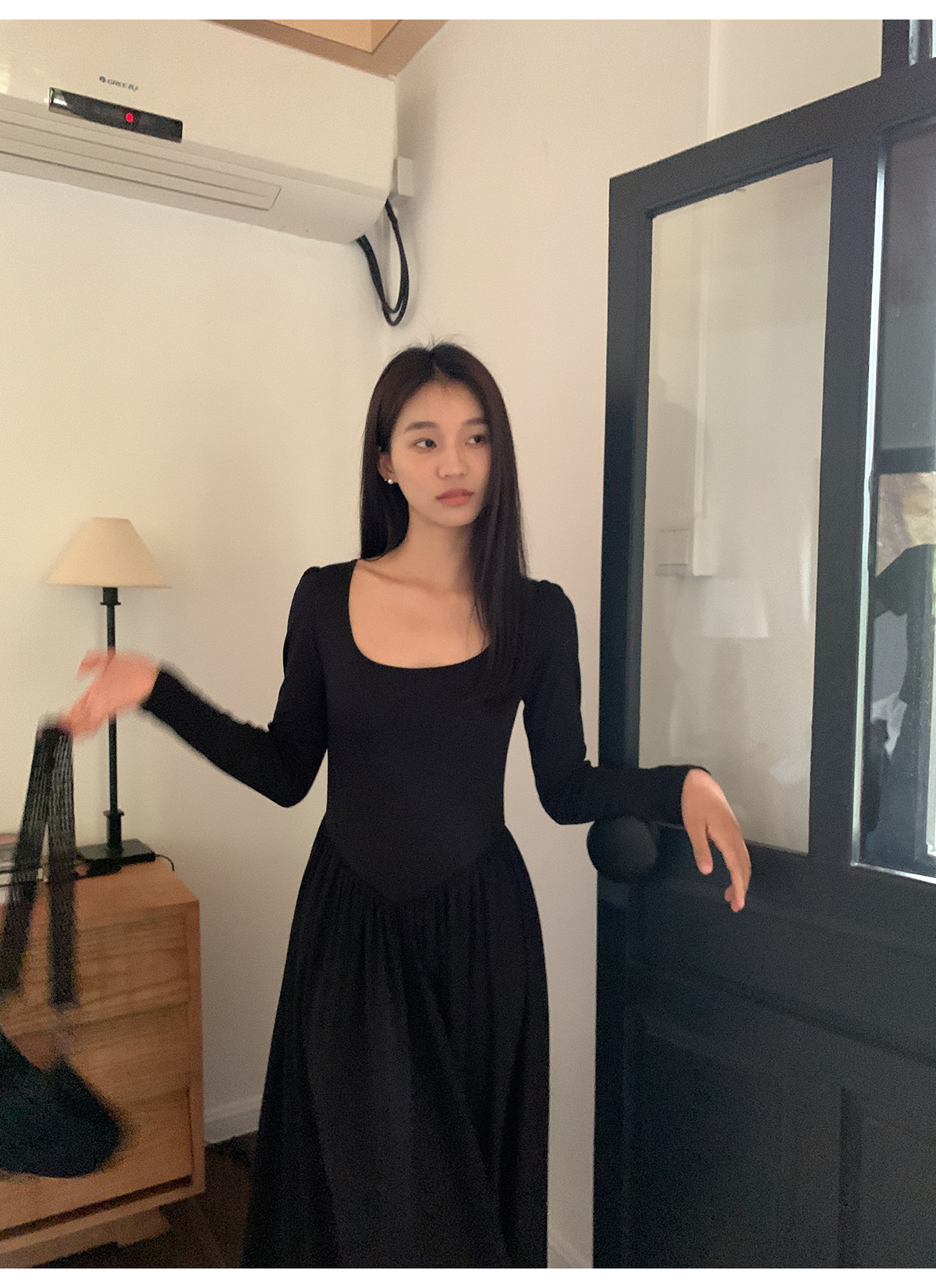 XXNING 芭蕾風優雅大U領露背連衣裙2023秋冬新款百褶溫柔甜美長裙
