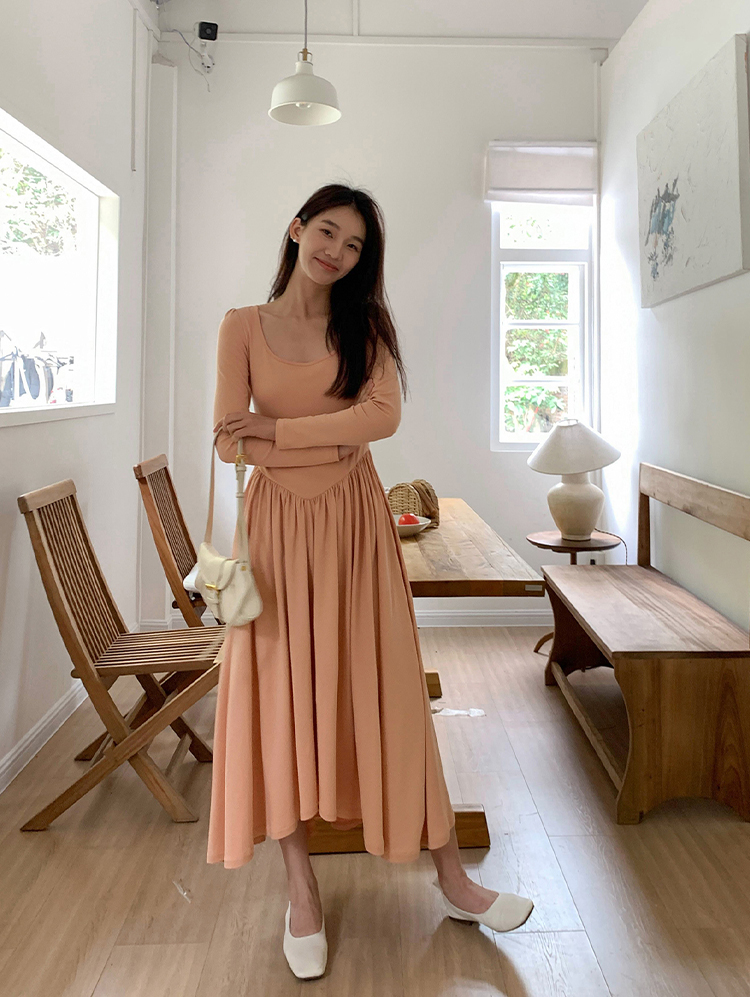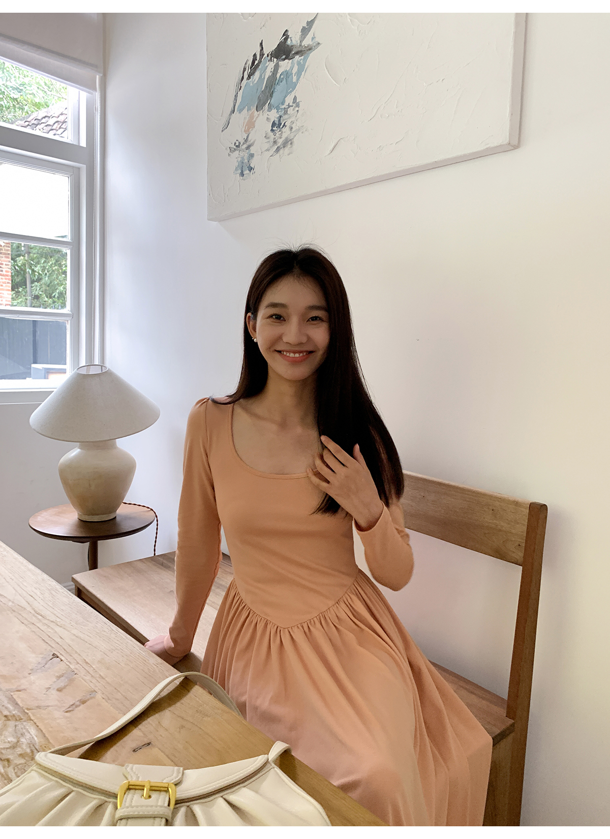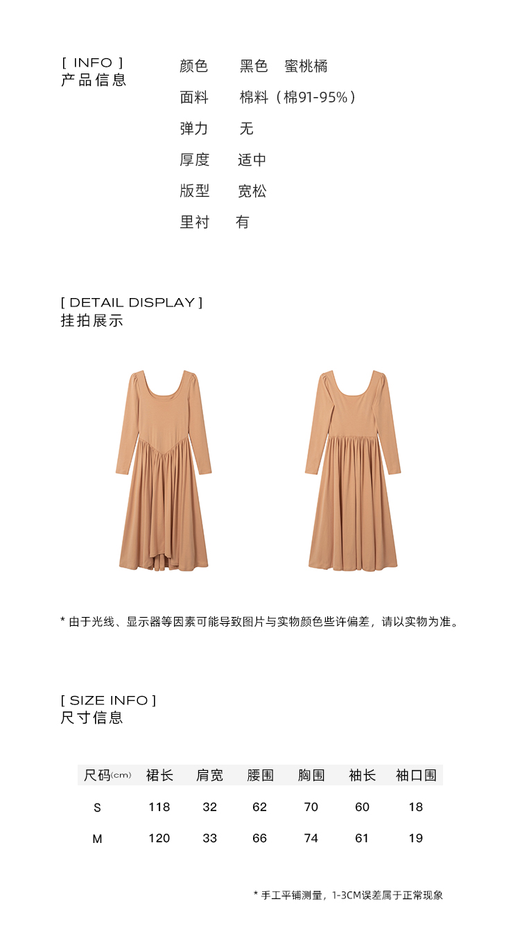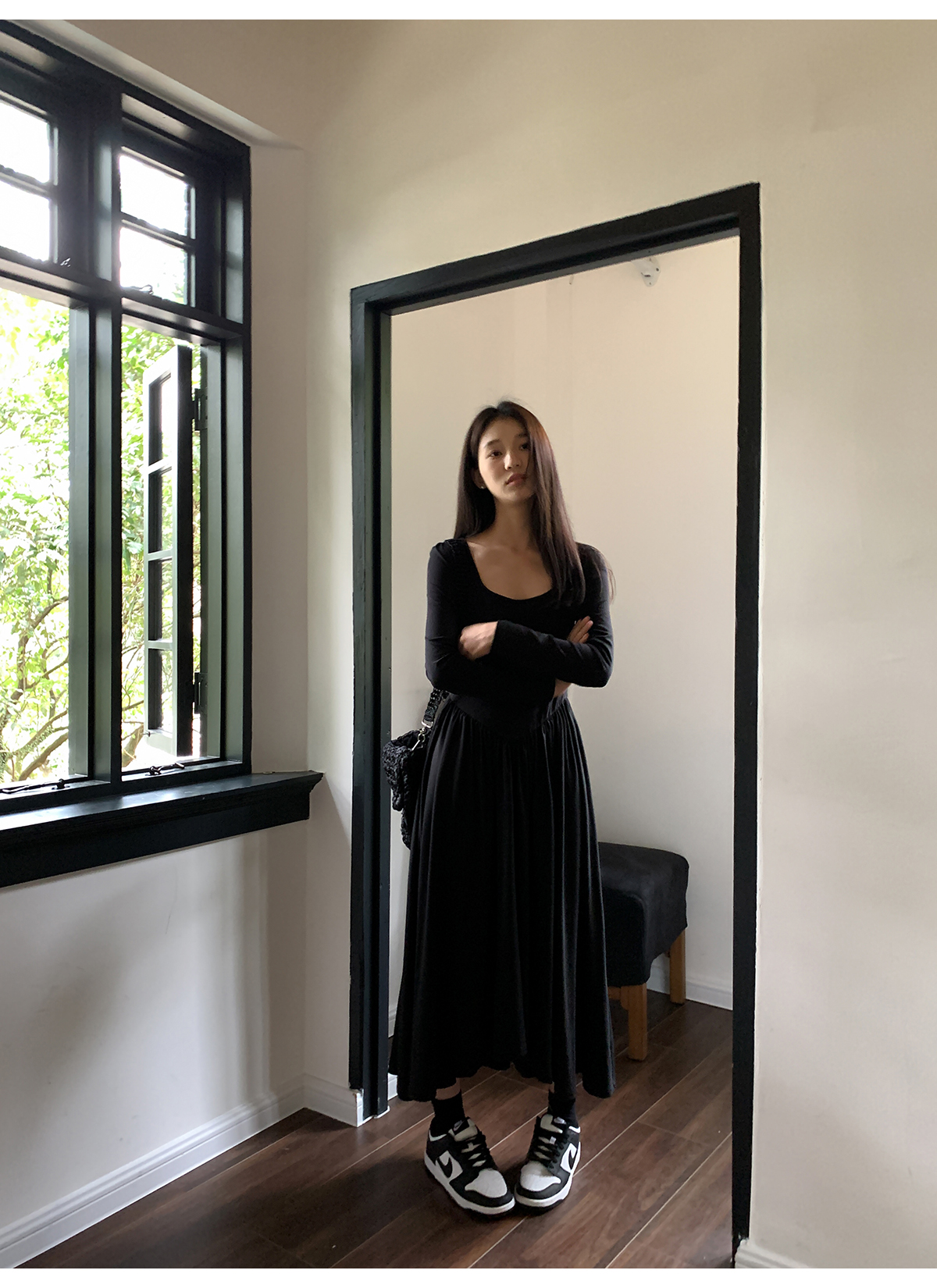 XXNING 芭蕾風優雅大U領露背連衣裙2023秋冬新款百褶溫柔甜美長裙
