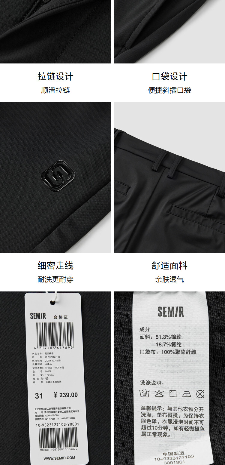 三福2023新款休閑褲男簡約小標直彈時尚修身小腳褲長褲褲子男