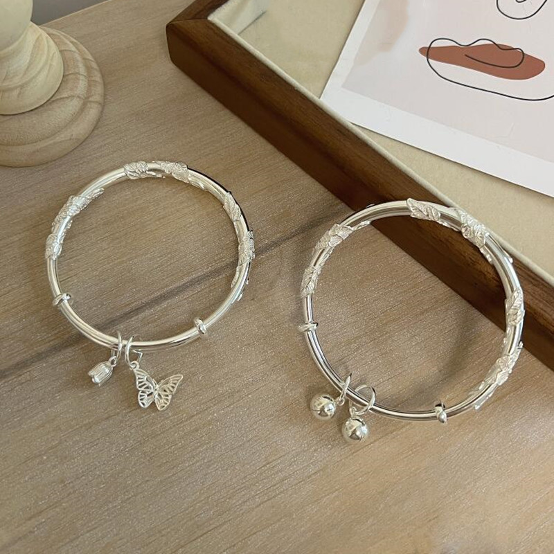 玫妃繁華似錦花絲蝴蝶鈴鐺純銀手鐲足銀9999百搭實心手環送女友
