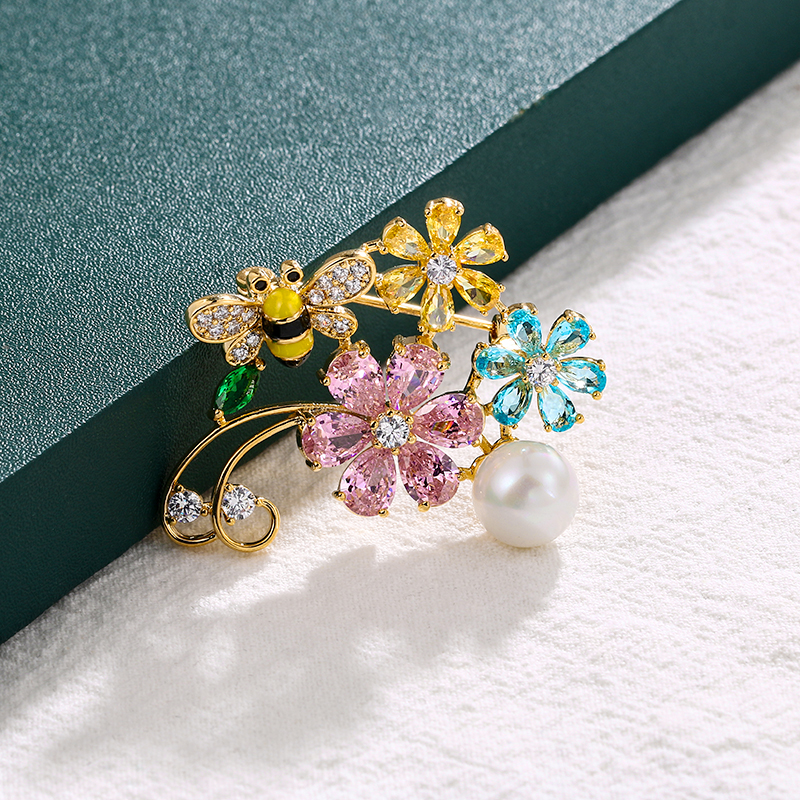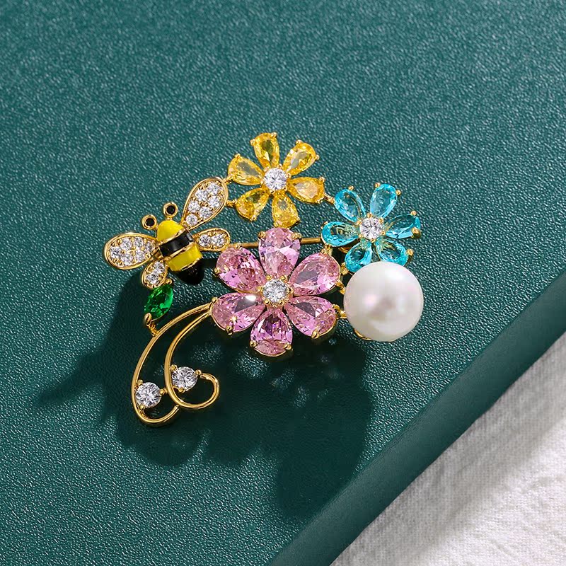 新款蜜蜂鑲嵌珍珠花朵胸針女可愛時尚百搭氣質彩色鋯石胸花別針