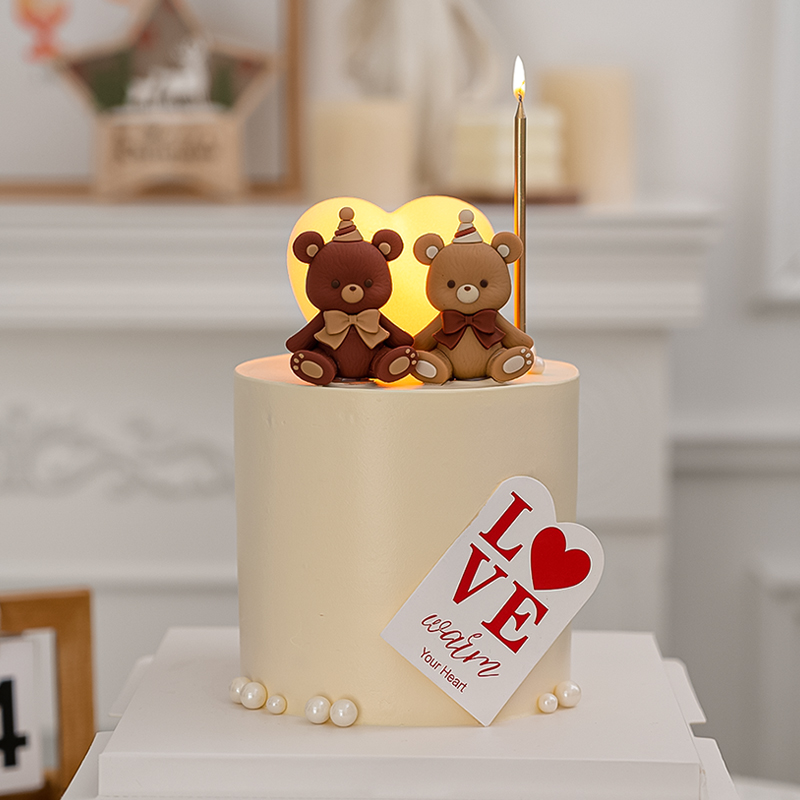 七夕情人節網紅卡通蝴蝶結小熊蛋糕裝飾擺件發光愛心燈蠟燭插件