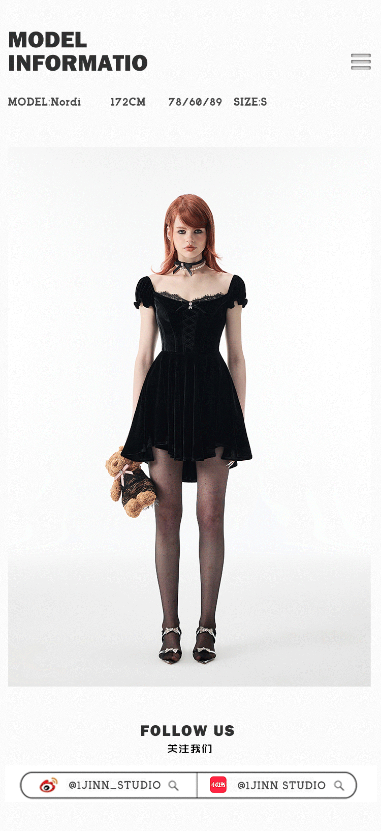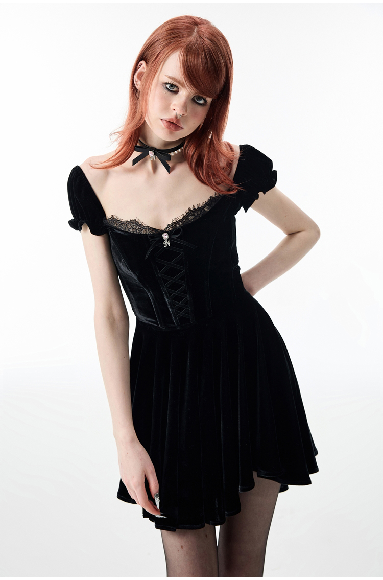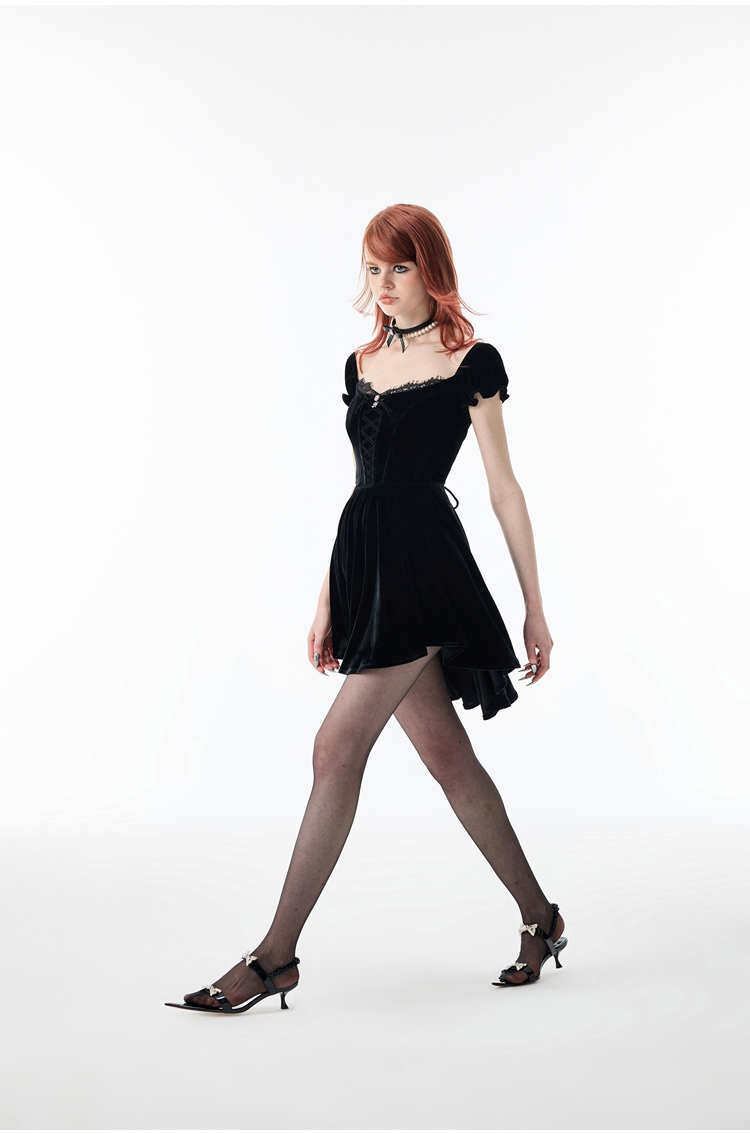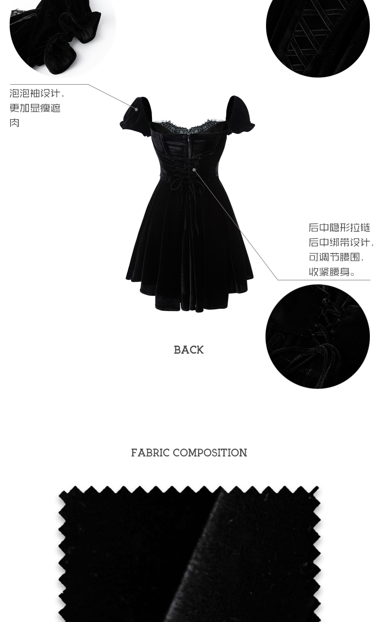1JINN STUDIO 隨心小黑裙收腰不規則A字裙絲絨低領泡泡袖連衣短裙