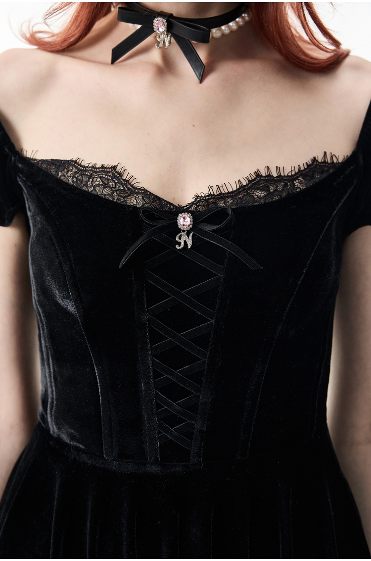 SagiDolls少女斗志超重工!兩穿黑色蝴蝶結一字肩連衣裙小禮服氣質