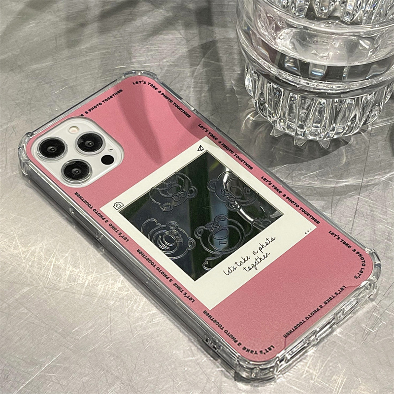 iphone13手機殼草莓熊 ins風卡通可愛 潮牌粉色鏡面女款個性創意補妝鏡情侶防摔藝術生夏天蘋果14promax軟殼