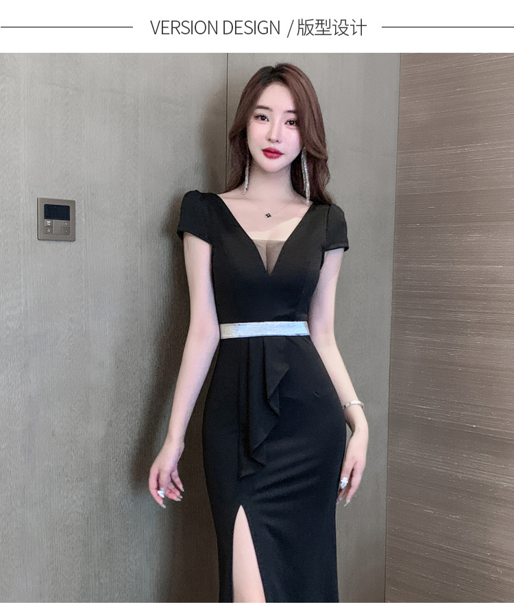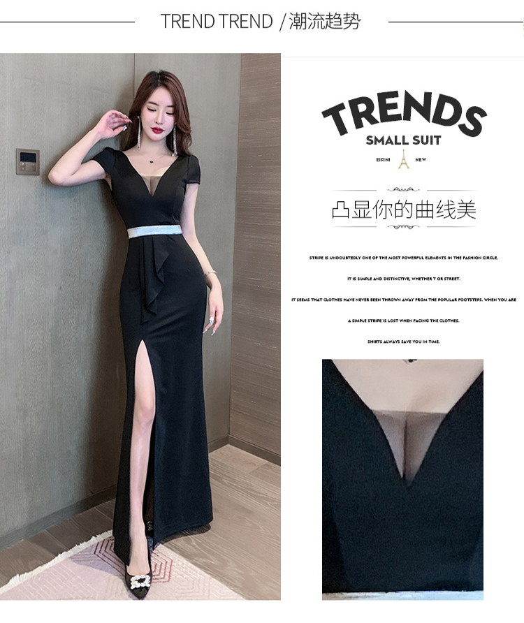 性感晚禮服長款名媛高端大氣低胸氣質短袖開叉露肩連衣裙黑色顯瘦