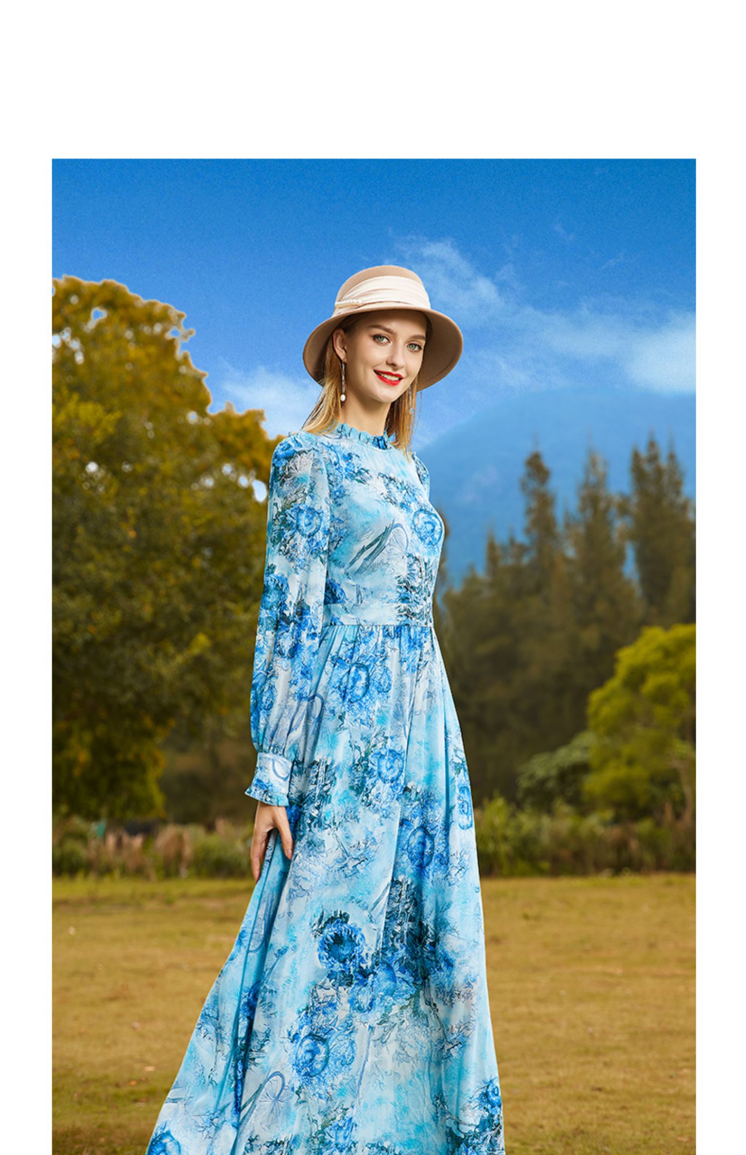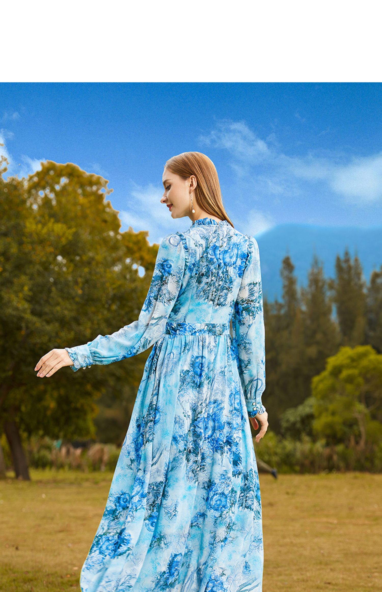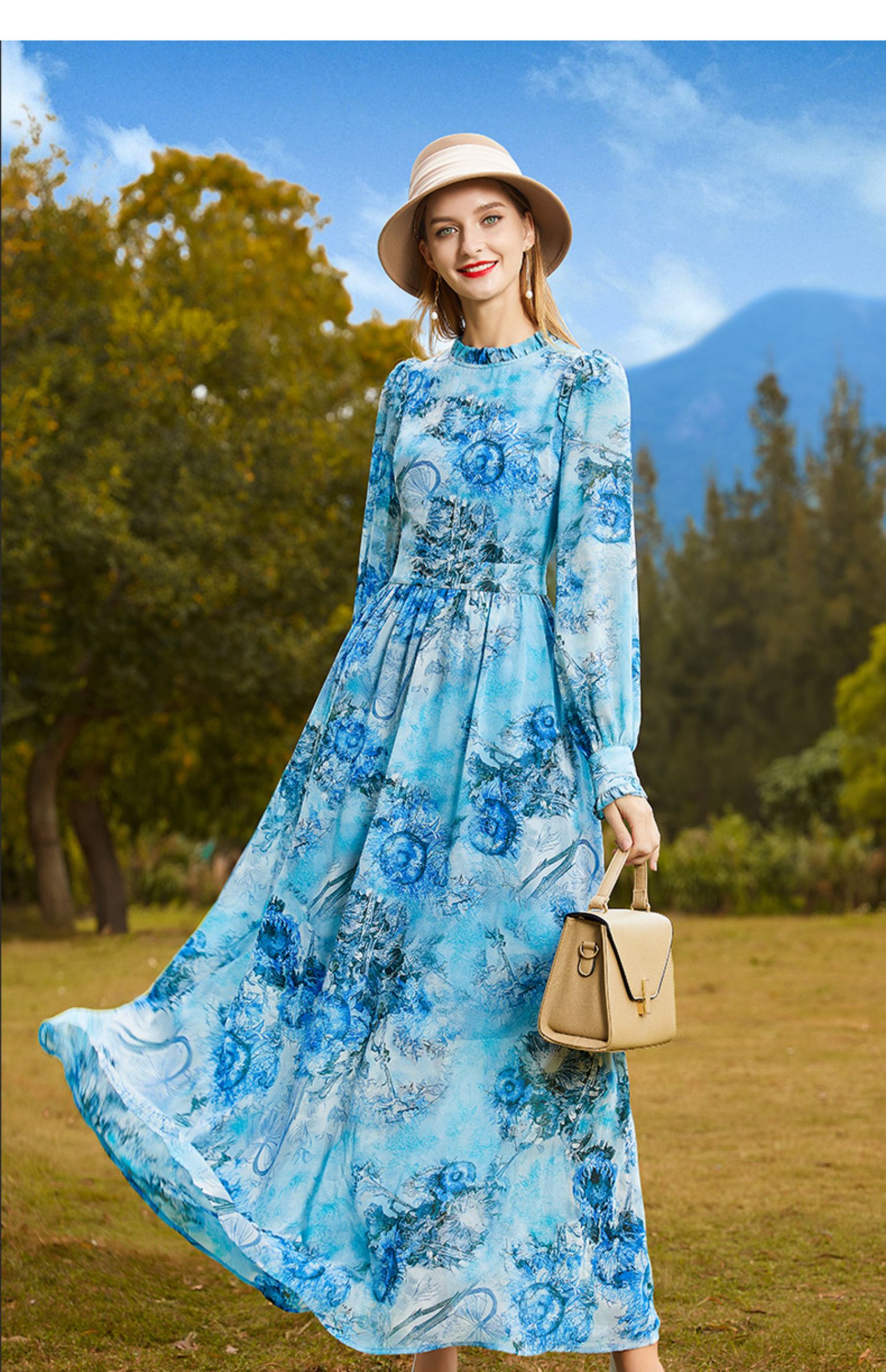 帝弗潤馳春季新款雪紡氣質藍色印花長款連衣裙女時尚修身法式長裙